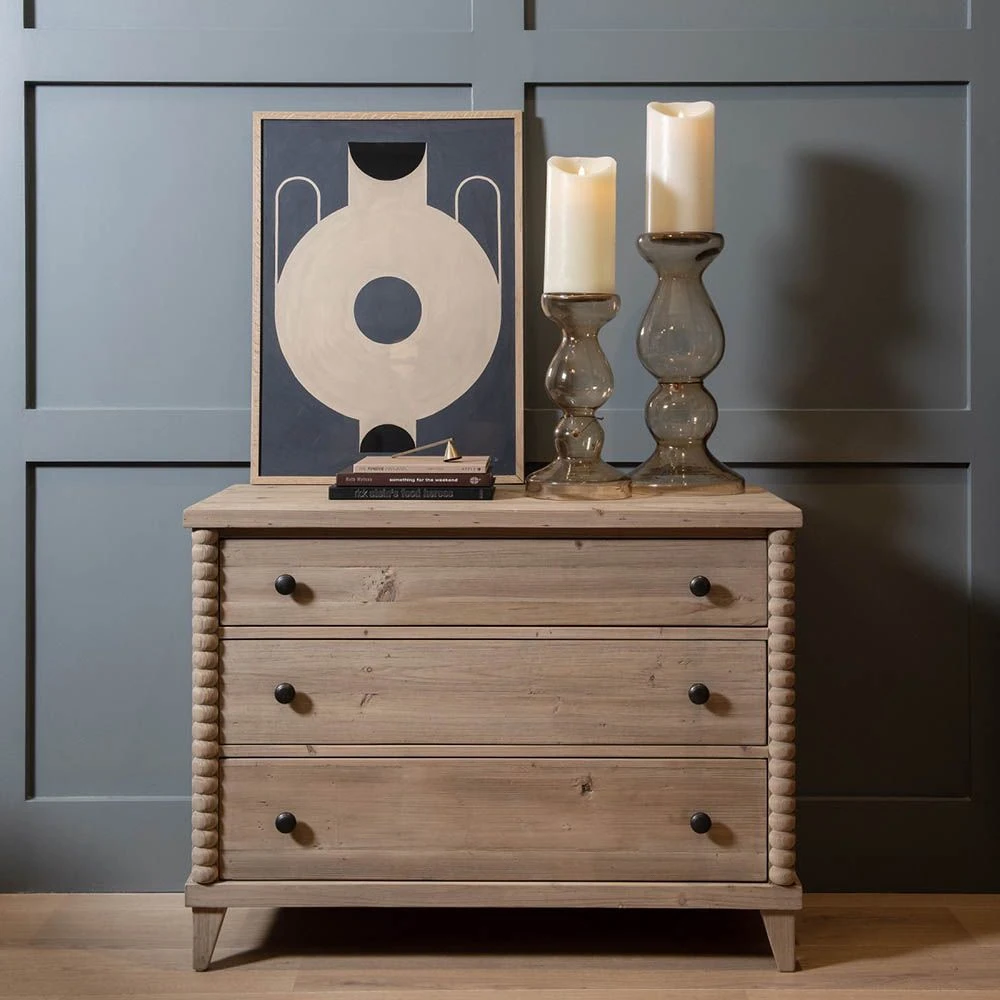 The Arietty Three Drawer Chest is a stunning addition to any bedroom, hallway or living space. Expertly crafted from high-quality recycled pine, this sustainable chest features three spacious drawers that provide ample storage space for clothes, linens, or other personal belongings. With its elegant design and timeless appeal, the Arietty Three Drawer Chest is sure to impress.