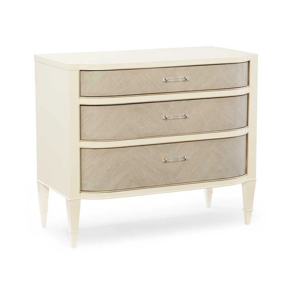 Dress Code lives up to its name with quarter-sawn oak drawers that are softly curved, inlaid with a chevron veneer pattern and finished in warm Heron Grey. The drawers are painted on the inside in a soft Taupe Paint. The top drawer has cord access. The drawers are surrounded by a fresh Wedding White frame that sits atop elegantly tapered legs. This classic look is dressed to impress your overnight guests.