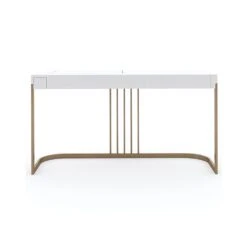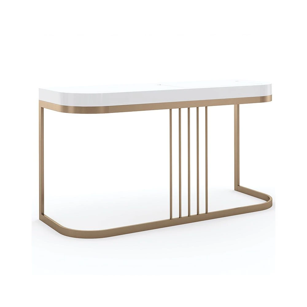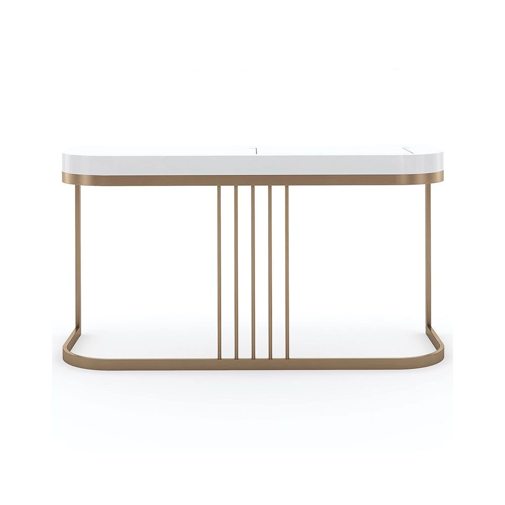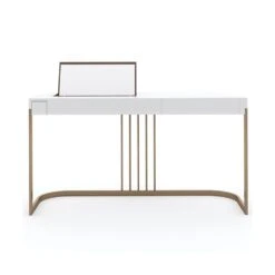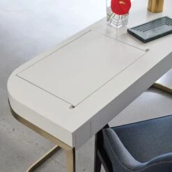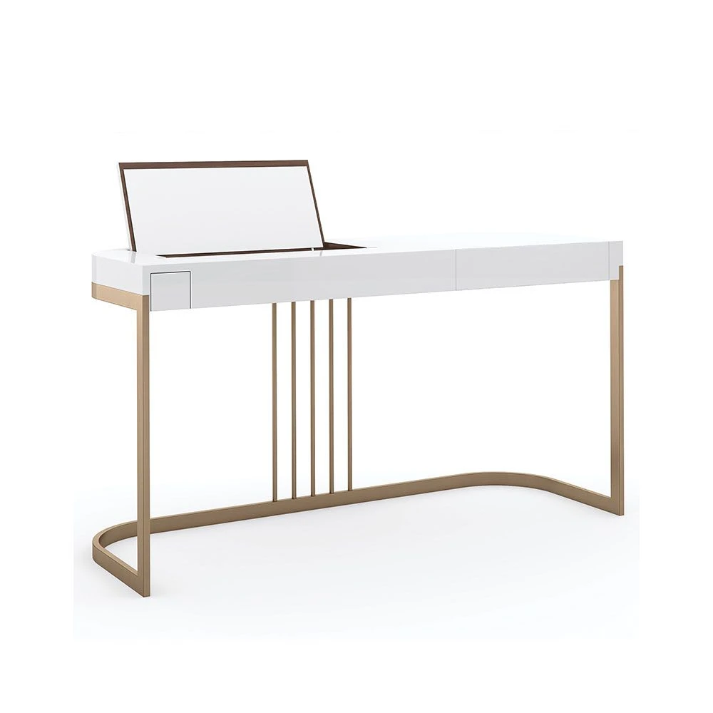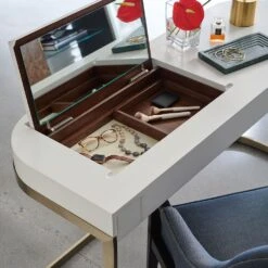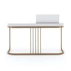Get ready in style with this chic and harmonious dressing table. The Beauty Bar Dressing Table features glamorous gold frame legs and a refined white surface containing a fold-out mirror with a sectioned space underneath, making this piece a striking, contemporary dream.