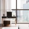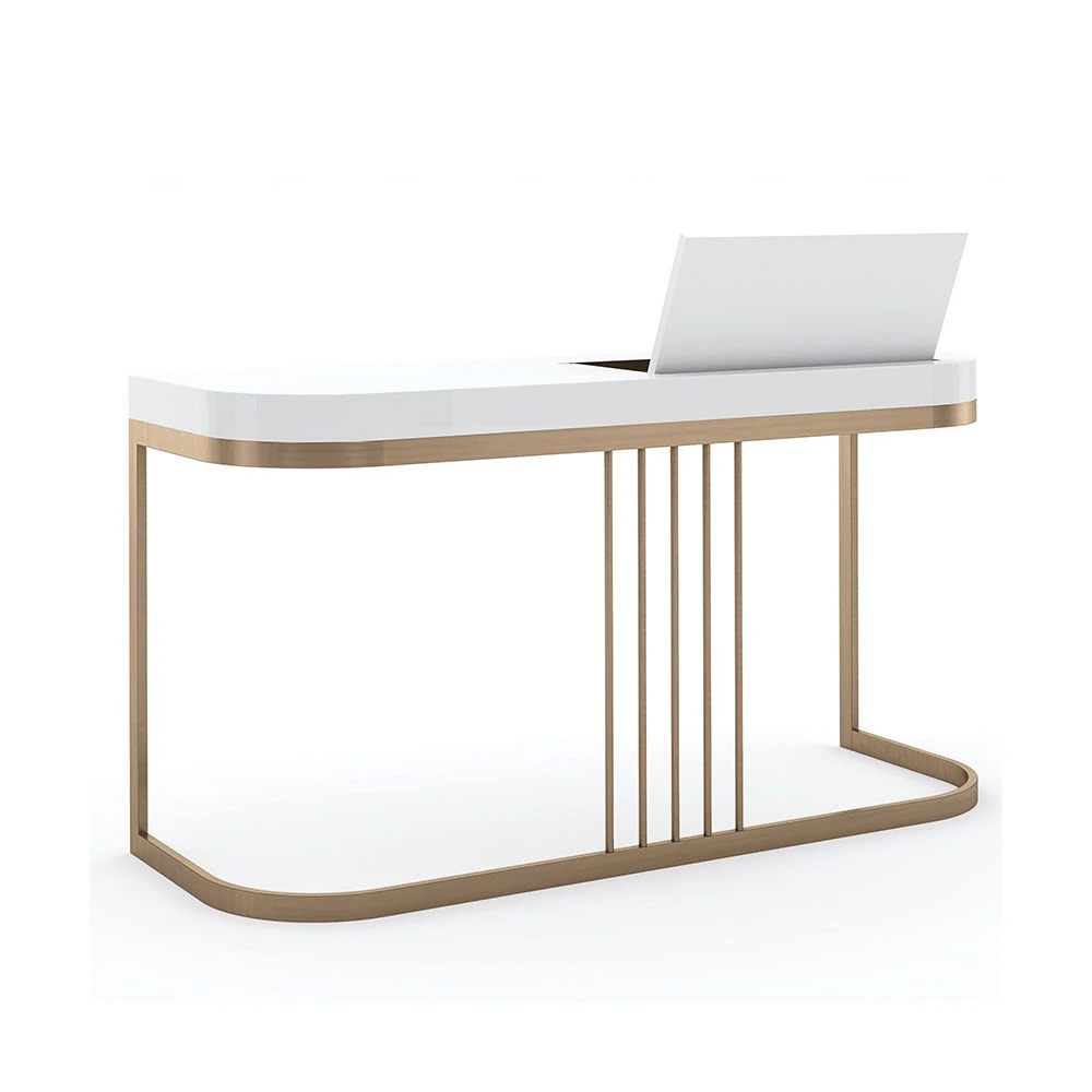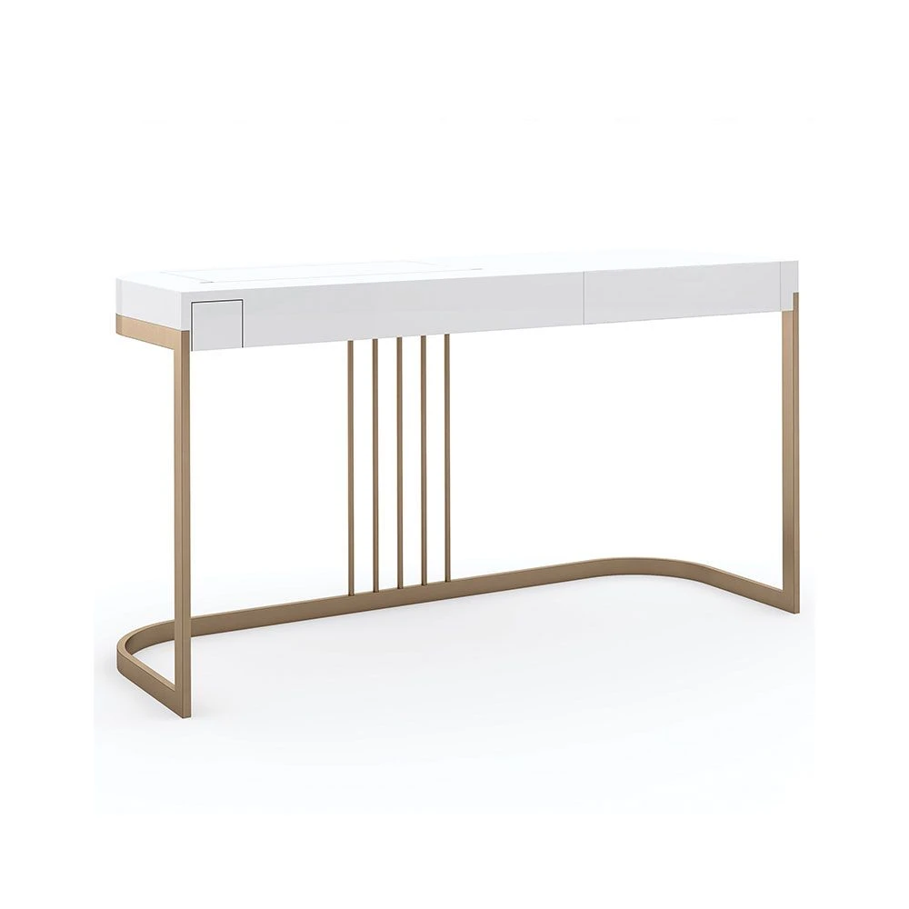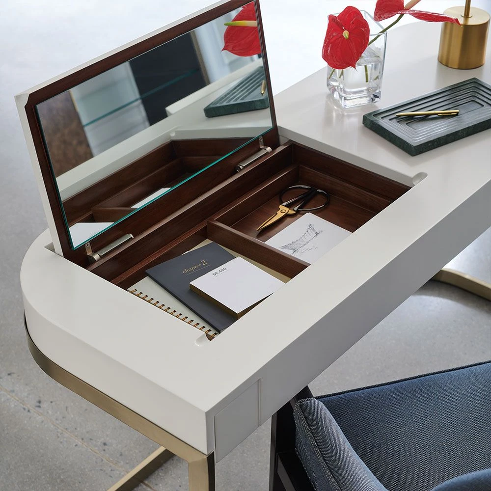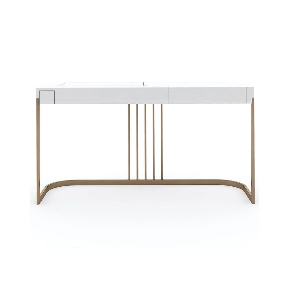 Get ready in style with this chic and harmonious dressing table. The Beauty Bar Dressing Table features glamorous gold frame legs and a refined white surface containing a fold-out mirror with a sectioned space underneath, making this piece a striking, contemporary dream.
