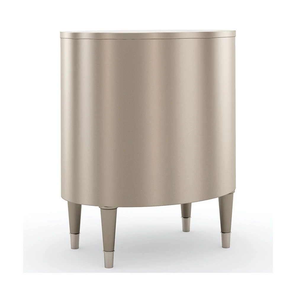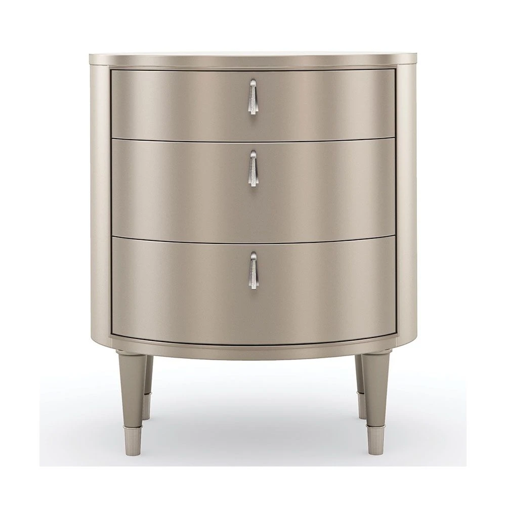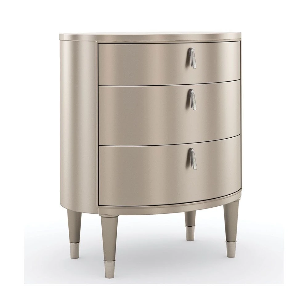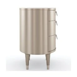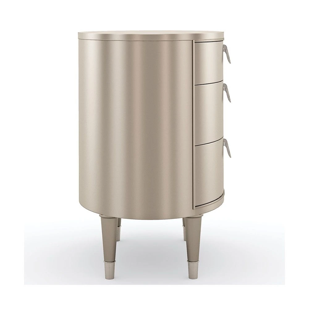 Integrate subtle elegance into your bedroom decor with the soft silver magnificence of this bedside table. With three drawers for ample storage, dainty pull handles and a svelte oval silhouette, this piece radiates a sense of gentle luxury with its shimmering finish that will suit any tasteful and contemporary interior style.
