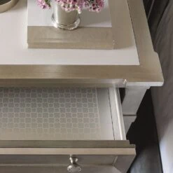 Adorn your bedroom with the beautiful, Buona Notte Bedside Table by Caracole. This stylish storage solution combines a glamorous, taupe silver-leaf application with tiger maple veneer and sparkling, jewellery-like hardware to create a dazzling display in your bedroom. It’s complete with a stunning platinum patterned interior, a pair of doors and a cream stone top that is perfect for placing your morning cup of tea or coffee on.