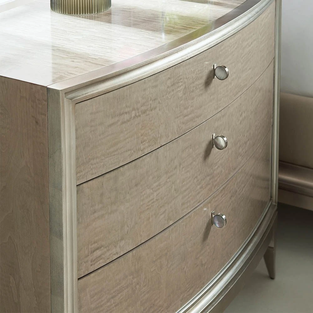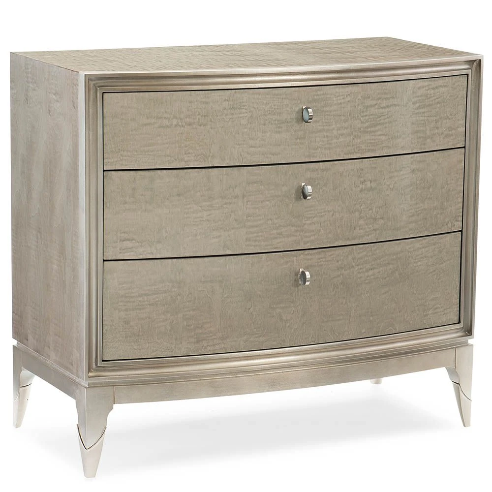A classic form with updated style, this three-drawer piece adds distinctive glamour. Its perfect proportions are highlighted with a Moonlit Sand finish over Silver Curly Maple, and outlined in Soft Silver Leaf around its front frame and base. Refreshingly balanced, its tailored design is perfect for modern lifestyles.