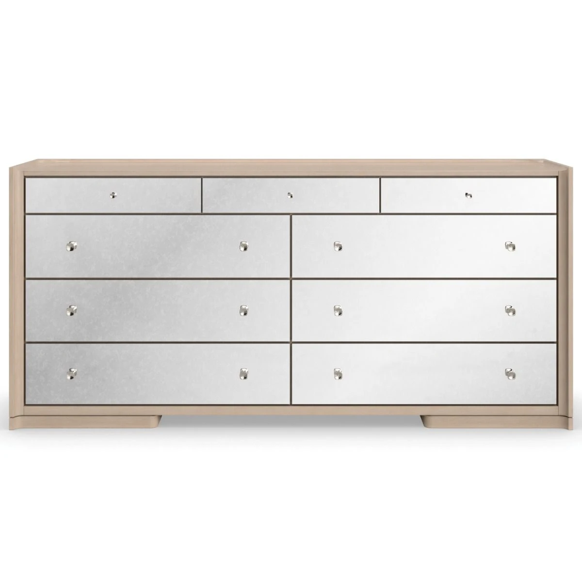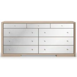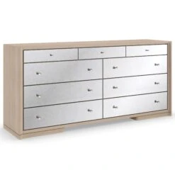 With its organic charm and refined aesthetic, this dresser epitomises casual luxury. Crafted with care from Japanese Sen veneers, the warm taupe finish of the piece complements any bedroom decor. Antique mirrored drawer fronts enhance the clean-lined design and add a touch of subtle rustic appeal while also reflecting light and illuminating the room. The top centre drawer features a felt-lined tray and metal pulls, adding a sophisticated element to this stunning piece.