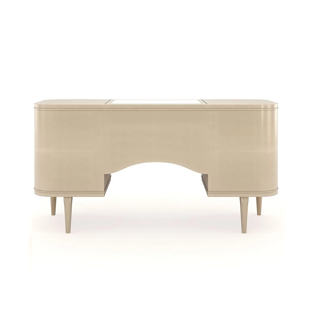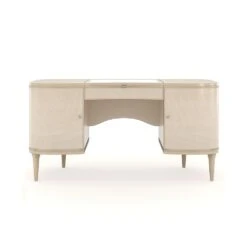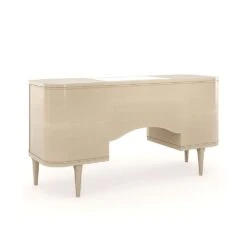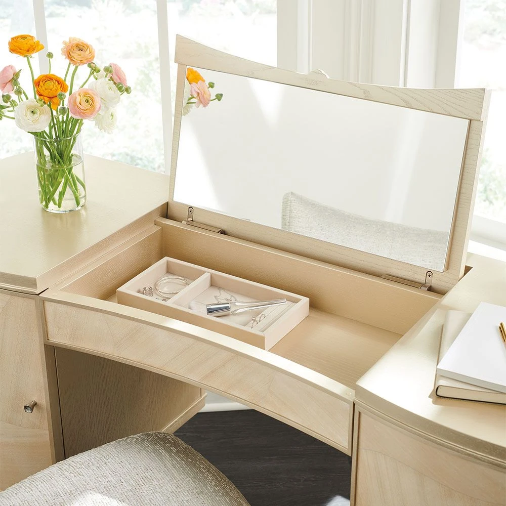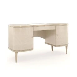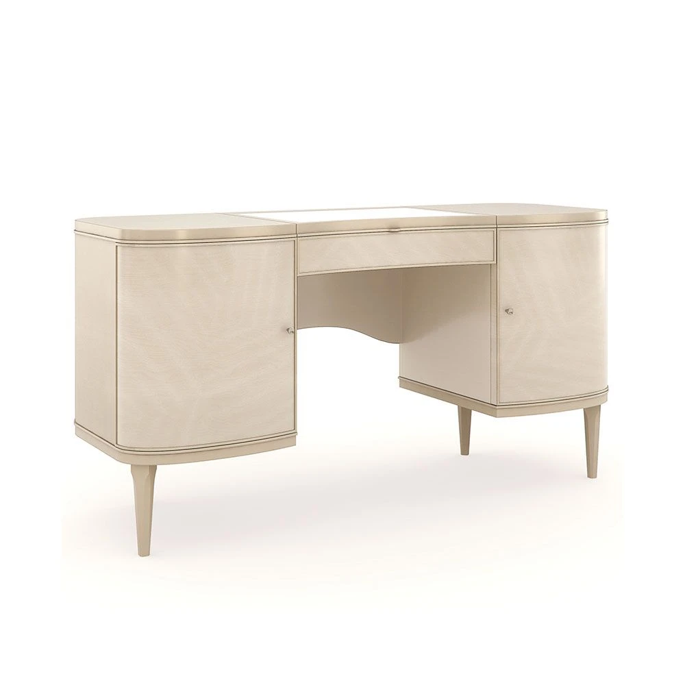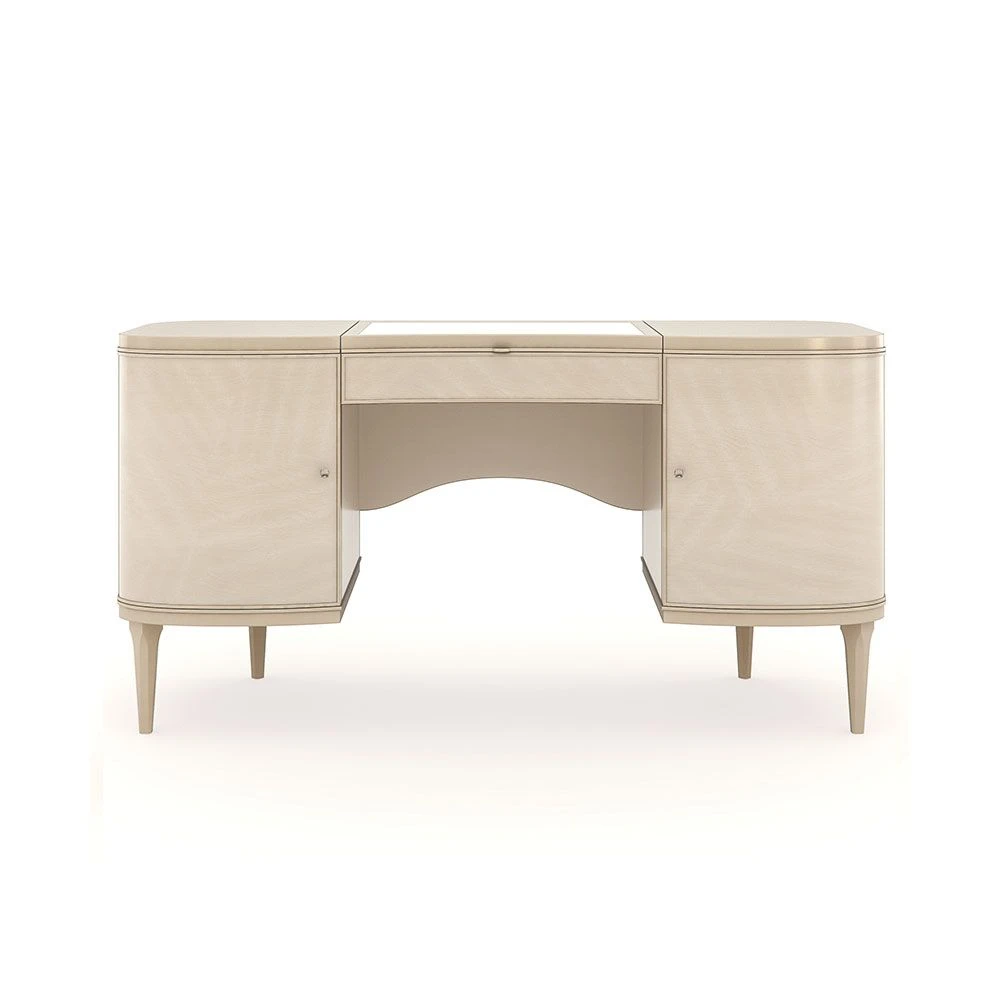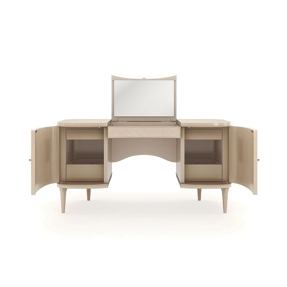 Embrace a touch of resplendence into your beauty routine with this demure and dazzling dressing table/desk. This piece features a fold-down mirror with storage underneath, that allows you to use this piece as a desk, or open it up and use it as a beauty station. There is extra storage within the cupboards, including two drawers and a sectional storage box.