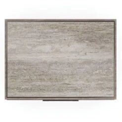 | Construction | Case in Mountain Smoke. Metal base and front frame molding in Deep Bronze. Silver Travertine stone top. Two drawers in Pearly White finish with undermount soft close guides. Drawer interior in Pearly White. Top is a natural stone. Natural variations in co |