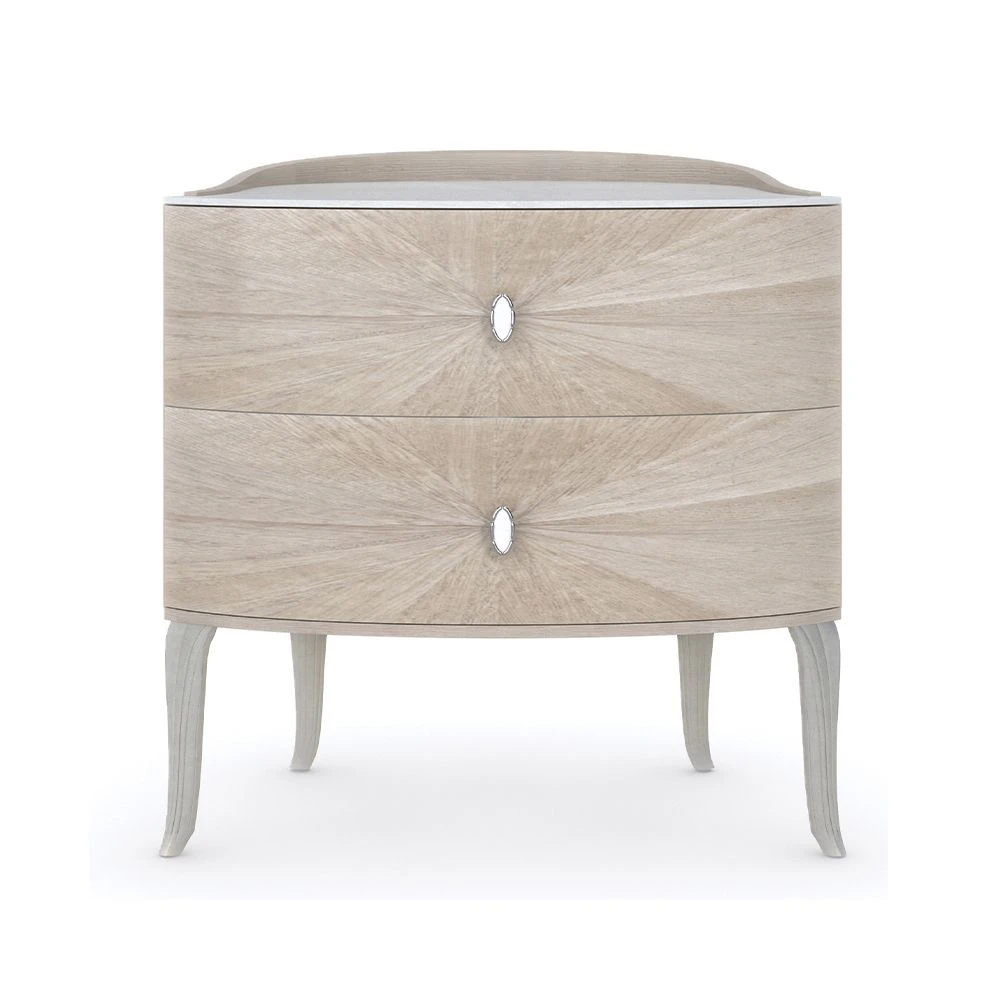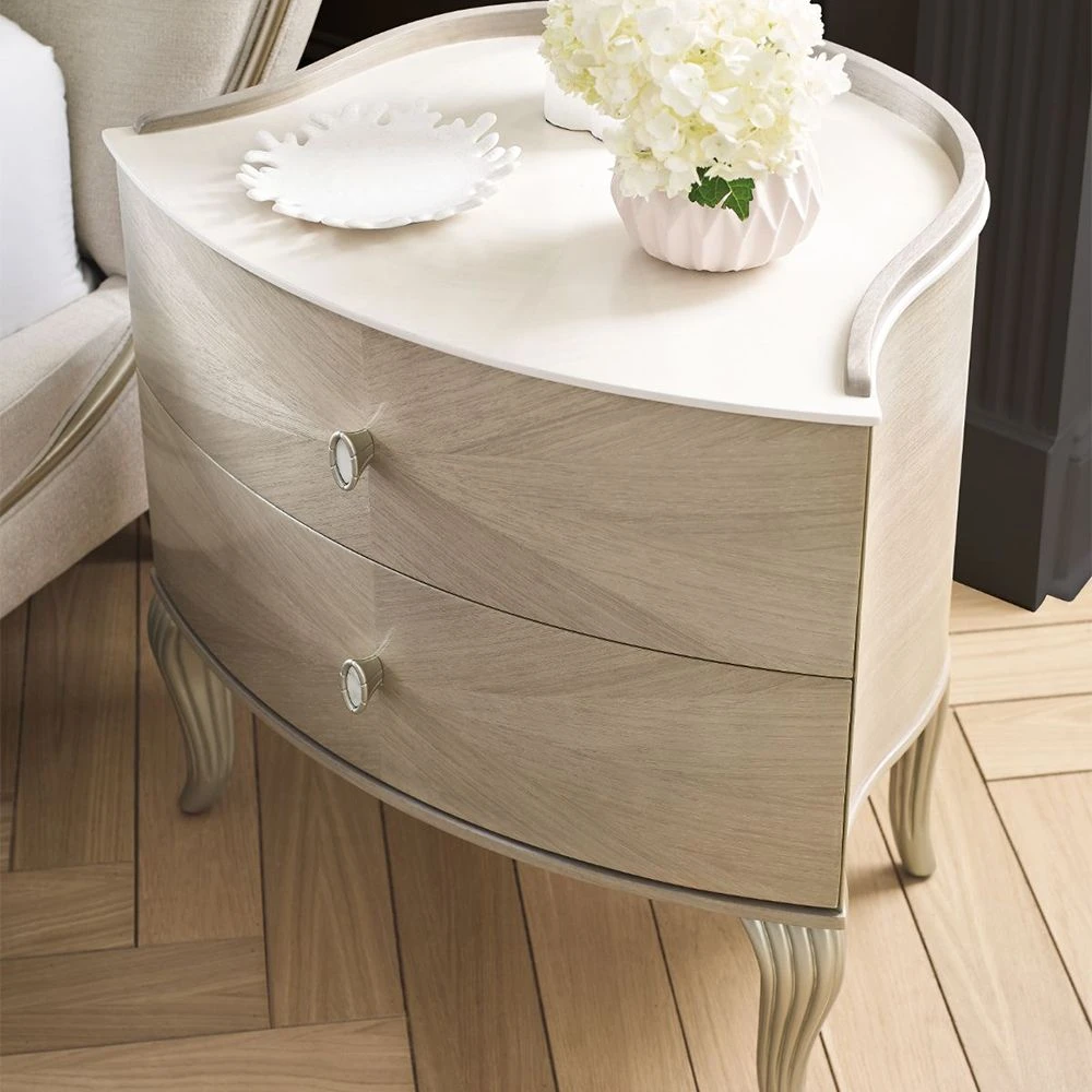 Invite a subtle baroque-inspired feel to your decor with the glamorous, classic silhouette of the Lilian Bedside Table. This piece exudes opulence with its curvaceous shape and champagne-finished legs. It also has two drawers for storing bedtime goodies.