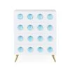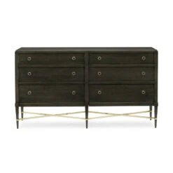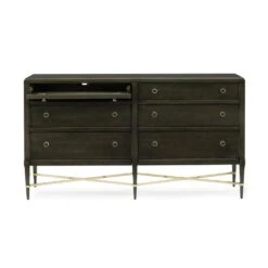 This piece truly lives up to its name… a bold and striking masterpiece of design and high-quality craftsmanship. The rich charcoal finish of the drawers contrasts beautifully against the whisper of gold geometric frame beneath the legs, giving this classic piece an intriguing modern twist. With a multitude of storage available, including two secret narrow drawers on the bottom frame, this piece is truly as majestic as it is perfectly practical.