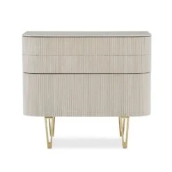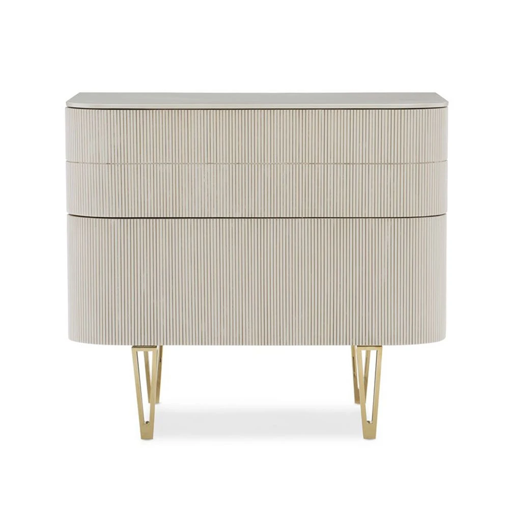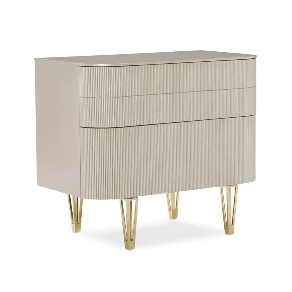 Fall in love with this glamorous bedside table from Caracole. This piece features a light fluting on the drawers and comes in an alluring off-white finish which is complemented by the dazzling gold feet. The three drawers offer ample storage, making this elegant unit as functional as it is beautiful.