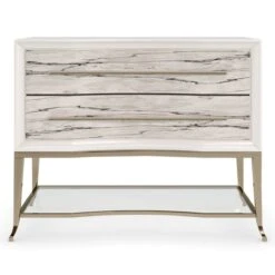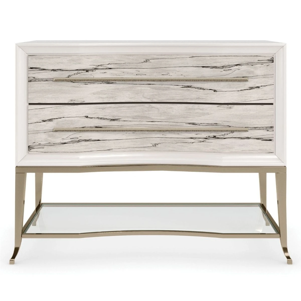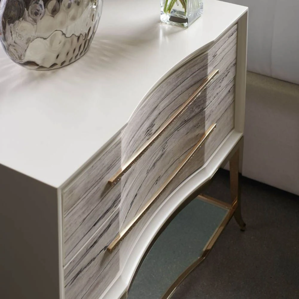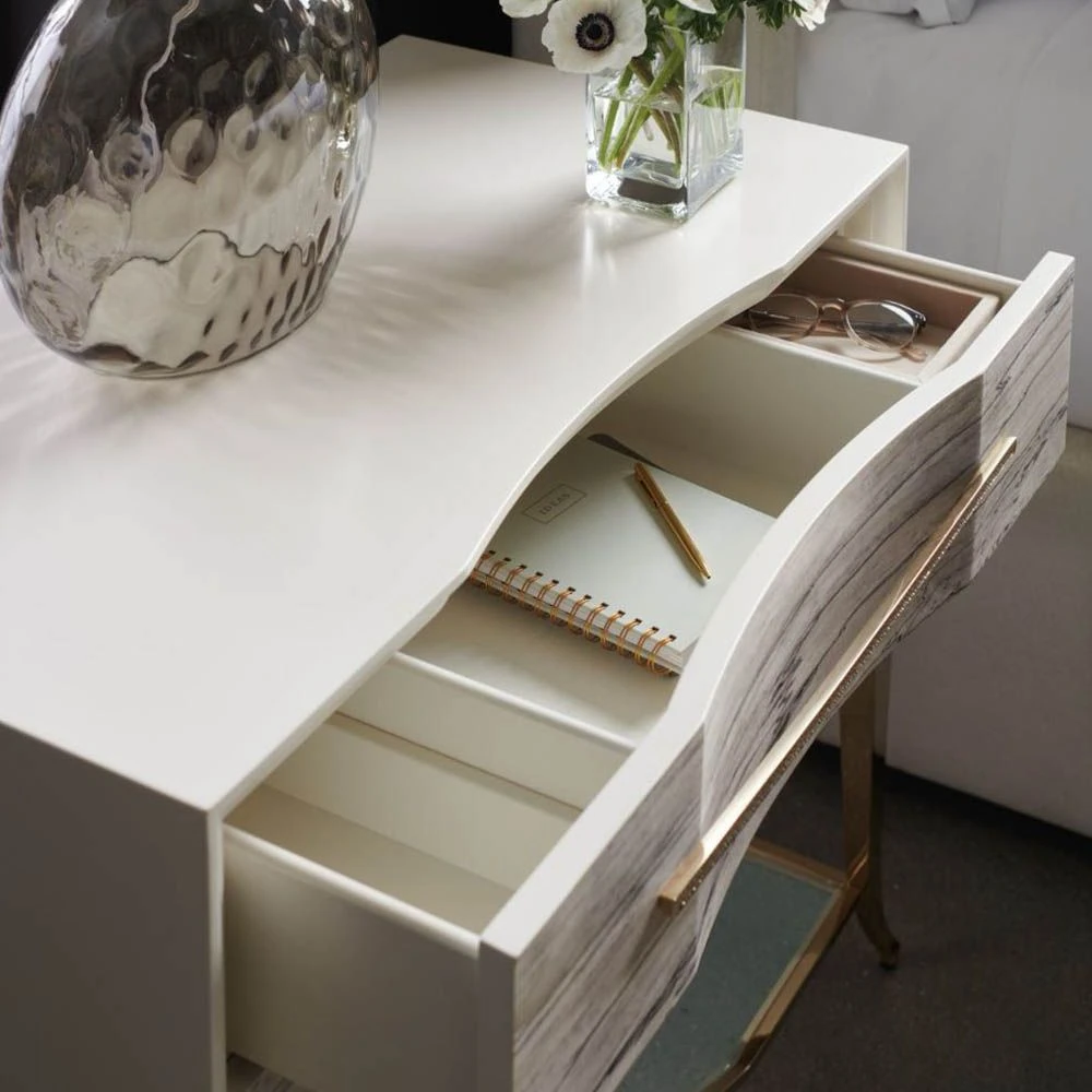 Indulge in the breathtaking allure and the natural beauty of this stunning nightstand. These artisan-crafted drawer fronts feature bleached white printed spalted maple, inspired by fallen snow. Dark veining patterns over a light ground give it an organic and sophisticated touch of luxury. The dimpled bar drawer pulls and golden base are glamorous complements to its gorgeous white finish, making it an ideal addition to your bedroom storage collection. Inside, the top drawer has dividers and a…