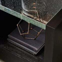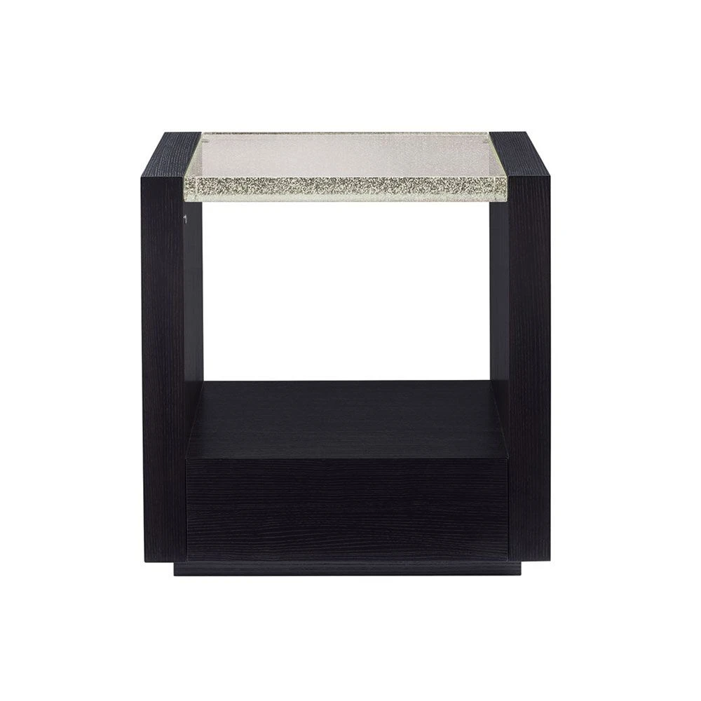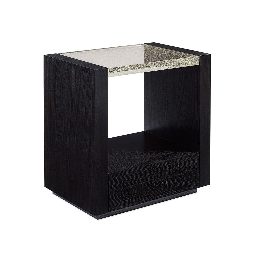 Make a bold and beautiful statement in your bedroom with this standout bedside table. It’s architectural lines and geometric profile are artfully accentuated by its chic and modern finish. Functional and fancy, this show-stopping bedside table is complete with a drawer, open storage area and a lighted, cast bubble glass top for added depth and dimension. Stylish and sophisticated!