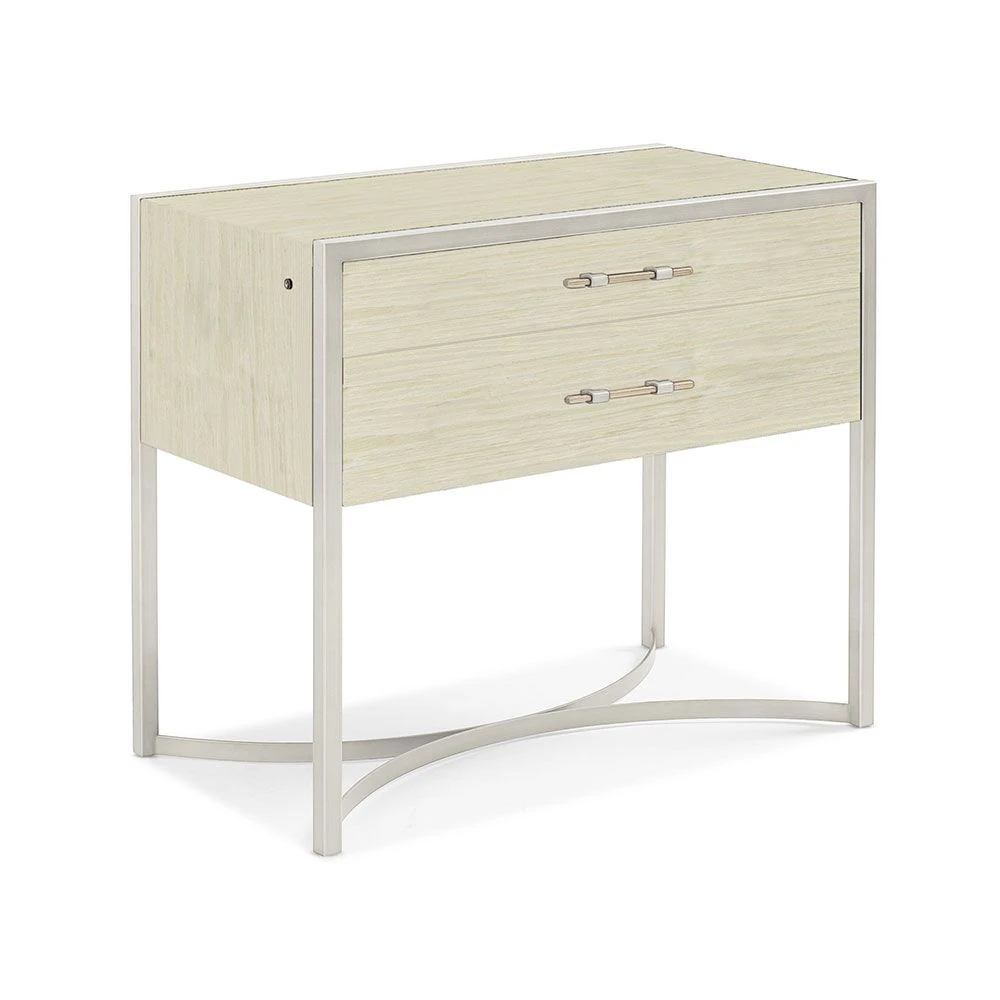 Decorate your bedroom with the resplendent, Remix Large Bedside Table. This charming bedside table features a gorgeous natural finish which is complemented by its lustrous metallic silver base and hardware. It will make a tasteful and timeless addition to any bedroom interior.
