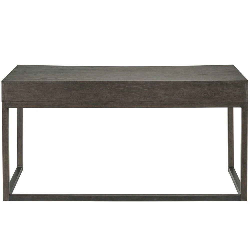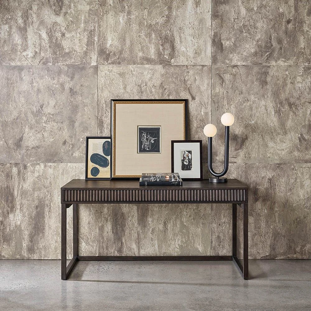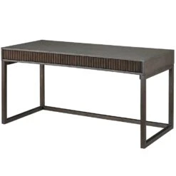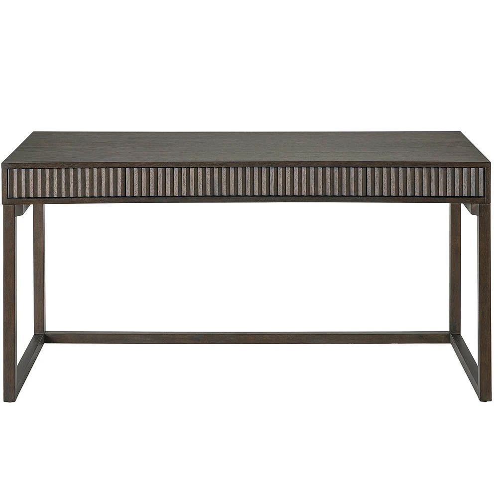 Welcome a bold refresh into your home office with the Claremont Desk, a sleek furnishing featuring a simplistic frame enriched by ridged detailing and a dark, robust finish.