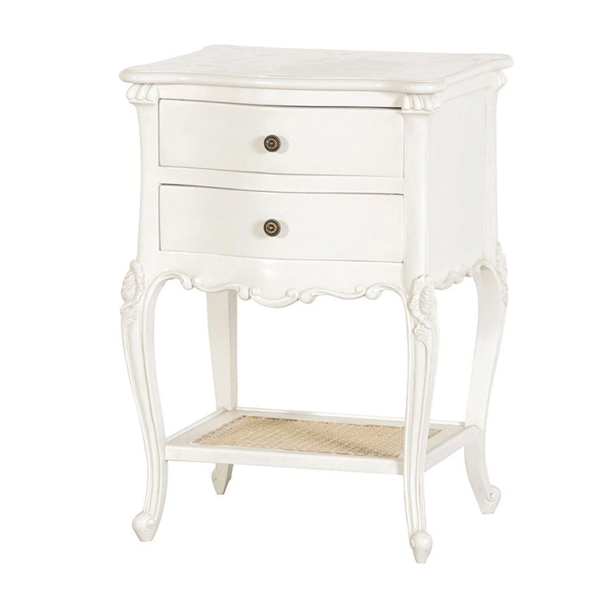 This is a very pretty 2 drawer bedside cupboard, mixing beautiful carvings with a rattan shelf, made with solid wood, this is a strong piece that will last.