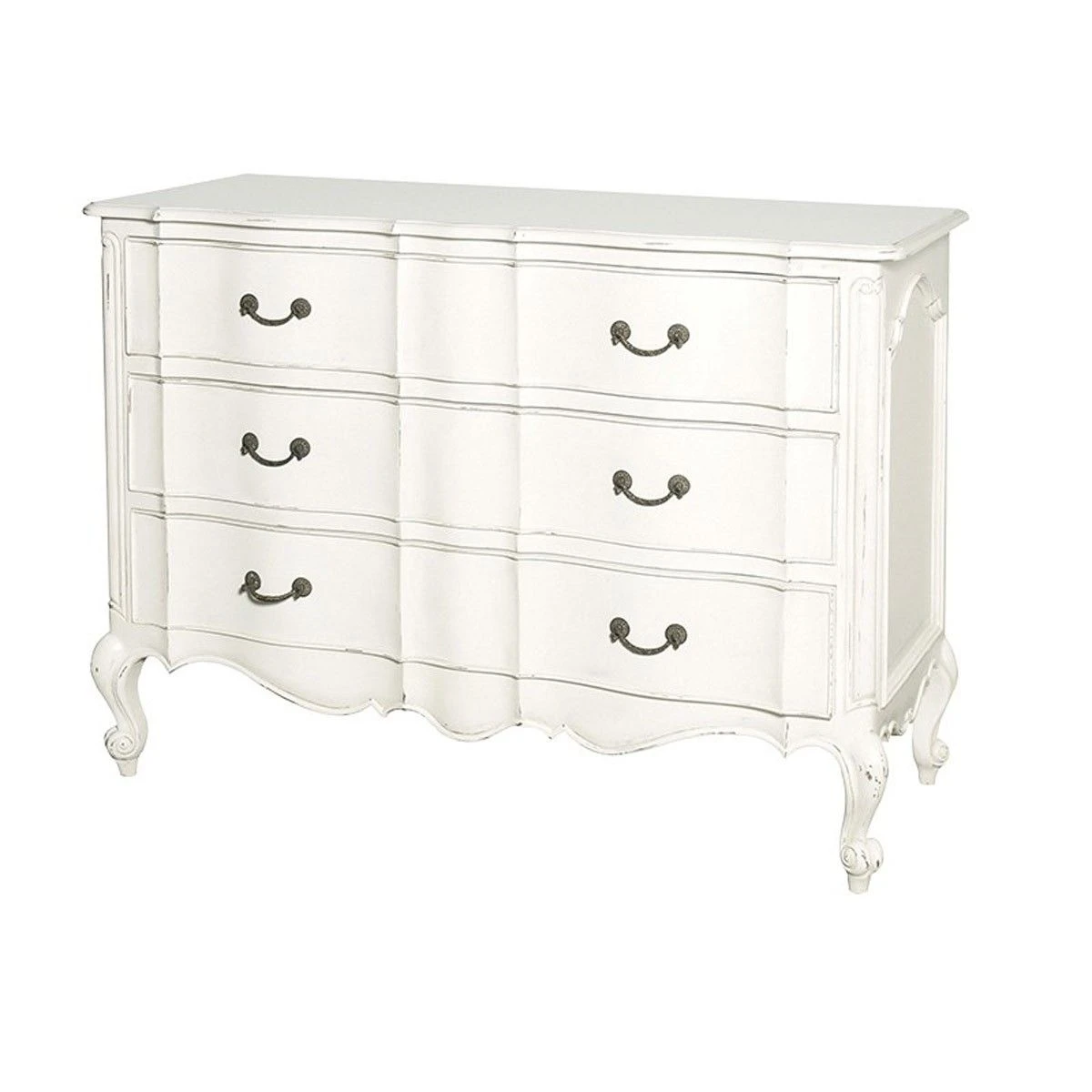 As seen in the Sunday Express. A lovely subtle shape with curves in the right places! Plain in design, slightly distressed and finished in antique white. 3 large drawers with blackened brass handles. *Our products within this range are in general made from a medium grade Mahogany timber, sourced from forests which are all part of regeneration programmes. Some of the larger panels in certain items are made from medium density fibreboard to ensure complete stability in all environments*