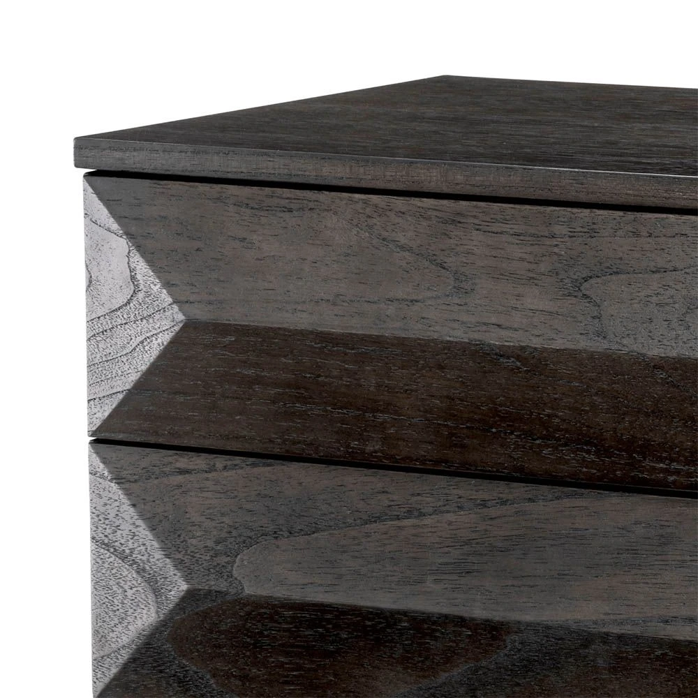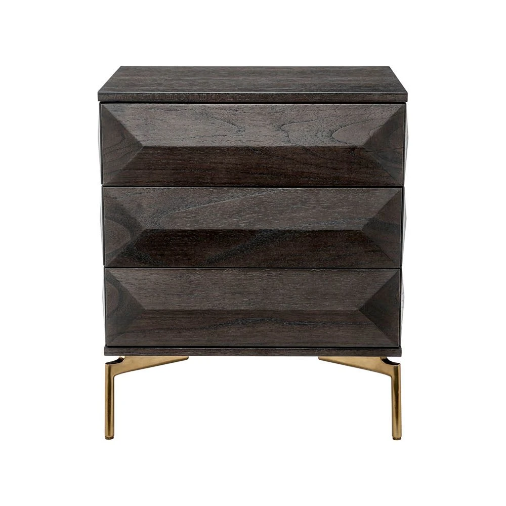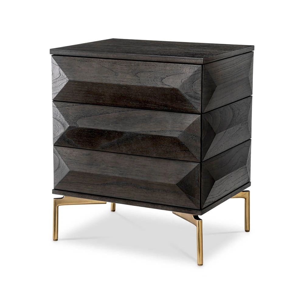 Make an ultra-modern statement with this stunning bedside table from Eichholtz. This piece features three drawers with a geometric shape to the mocha-coloured wood for an alluring style and adequete storage. Mounted on brass legs for an added touch of glamour, this piece would fit in effortlessly into a stylish and contemporary space.