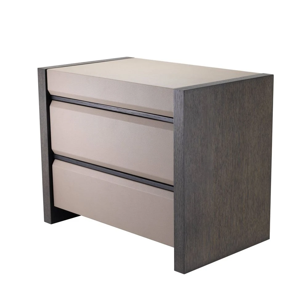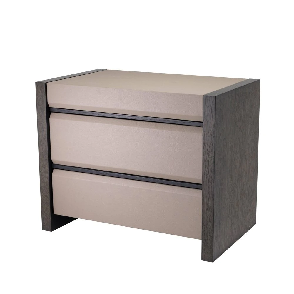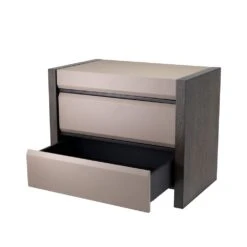 Adorn your bedroom space with the luxurious Meribel Bedside Table by Eichholtz. The 2-drawer table comes in lovely mocha oak veneer, with a gorgeous, grey leather look finish – a simplistic yet stylish, contemporary design.