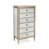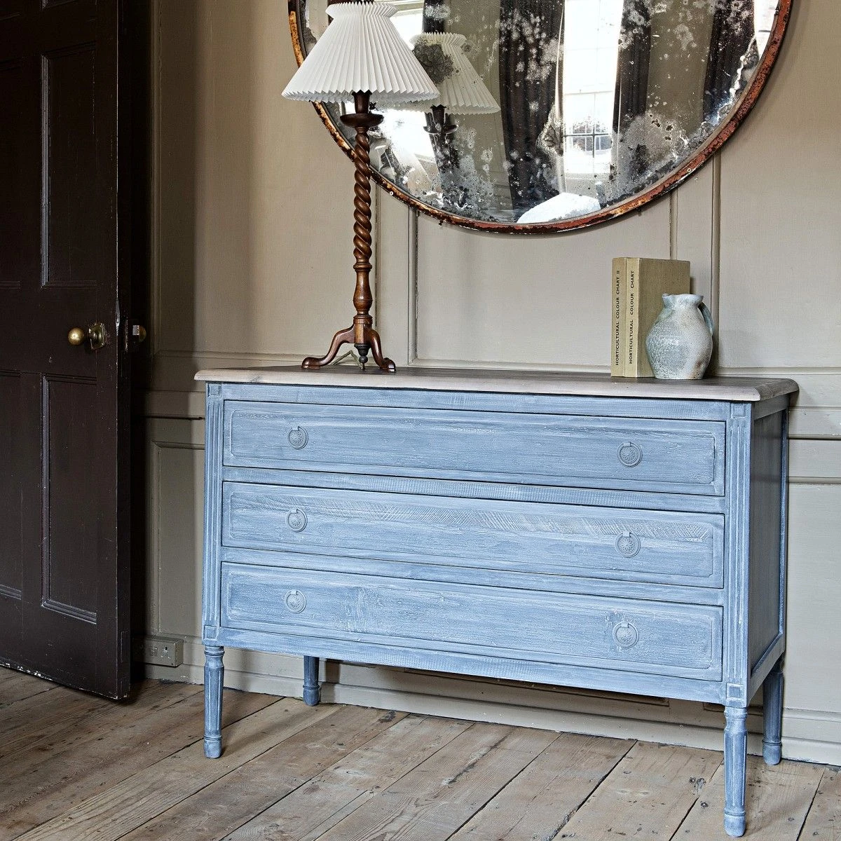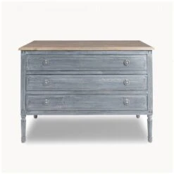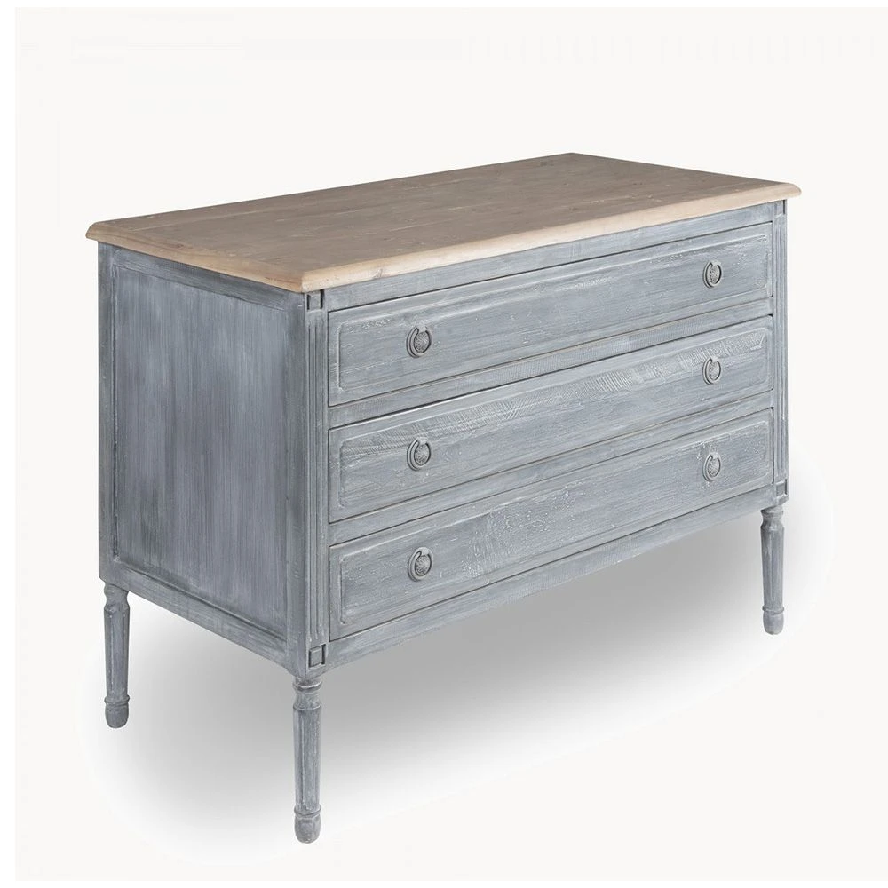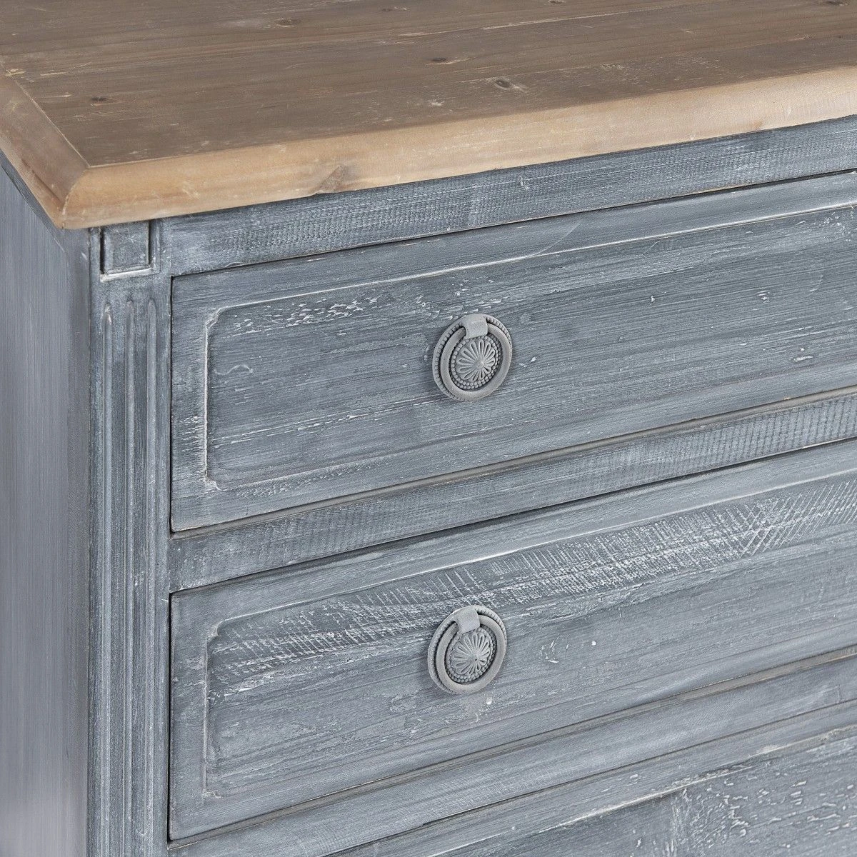 Incorporate some artsy charm into your decor with the dreamy Evangeline Chest of Drawers. This piece features an alluring distressed grey finish, with round handles and a natural wood top for an overall quaint and charismatic appeal. This french inspired piece will be a perfect, elegant storage solution for any home looking to create an enchanting, country-style atmosphere.