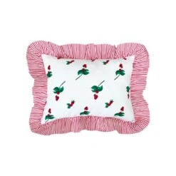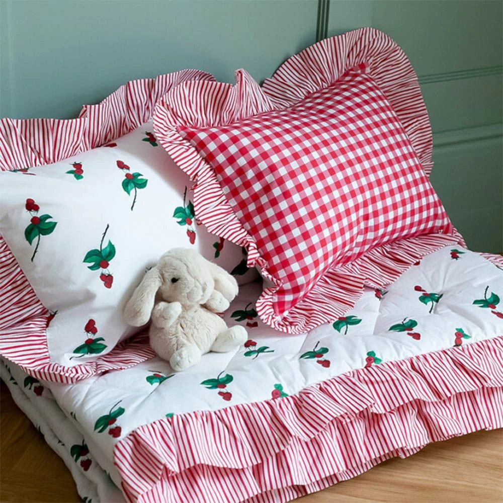 Snuggle up with an adorable quilt and pillow set patterned with delicious ripe raspberries. Bordered with pinstriped ruffles and lined with 100% organic cotton, this is the most perfect bedding to tuck your kids into and let them rest in cosy, cute style.