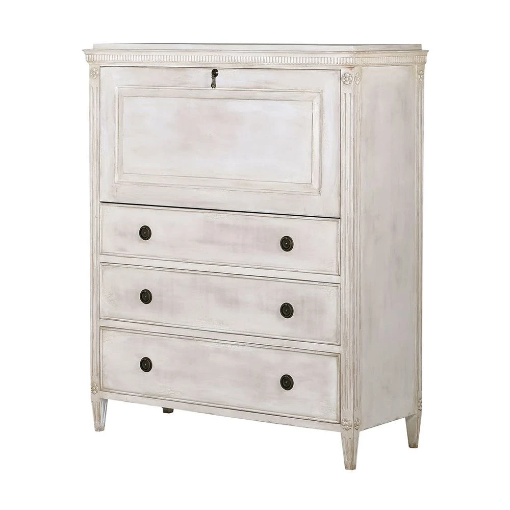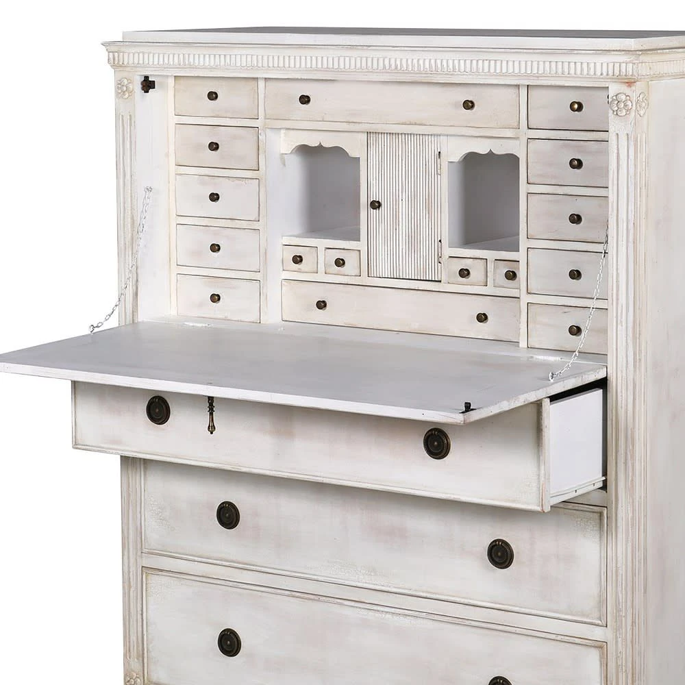 Incorporate a prestige presence in your bedroom with the Harriet Chest Of Drawers. This classic chest of drawers, hand crafted by an antique white wood with mahogany accents, boasts a timeless allure with a French touch. This piece also features a hidden desk and extra drawers for storage, what more could you need!