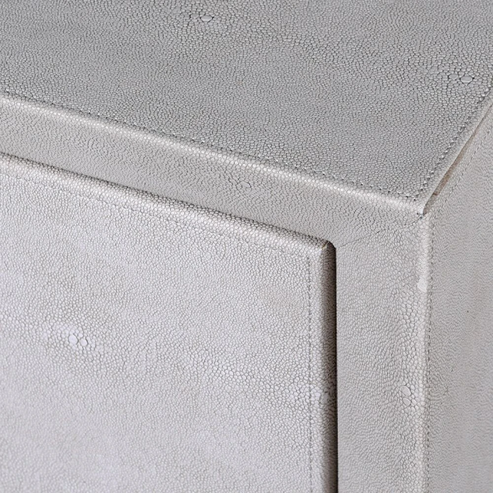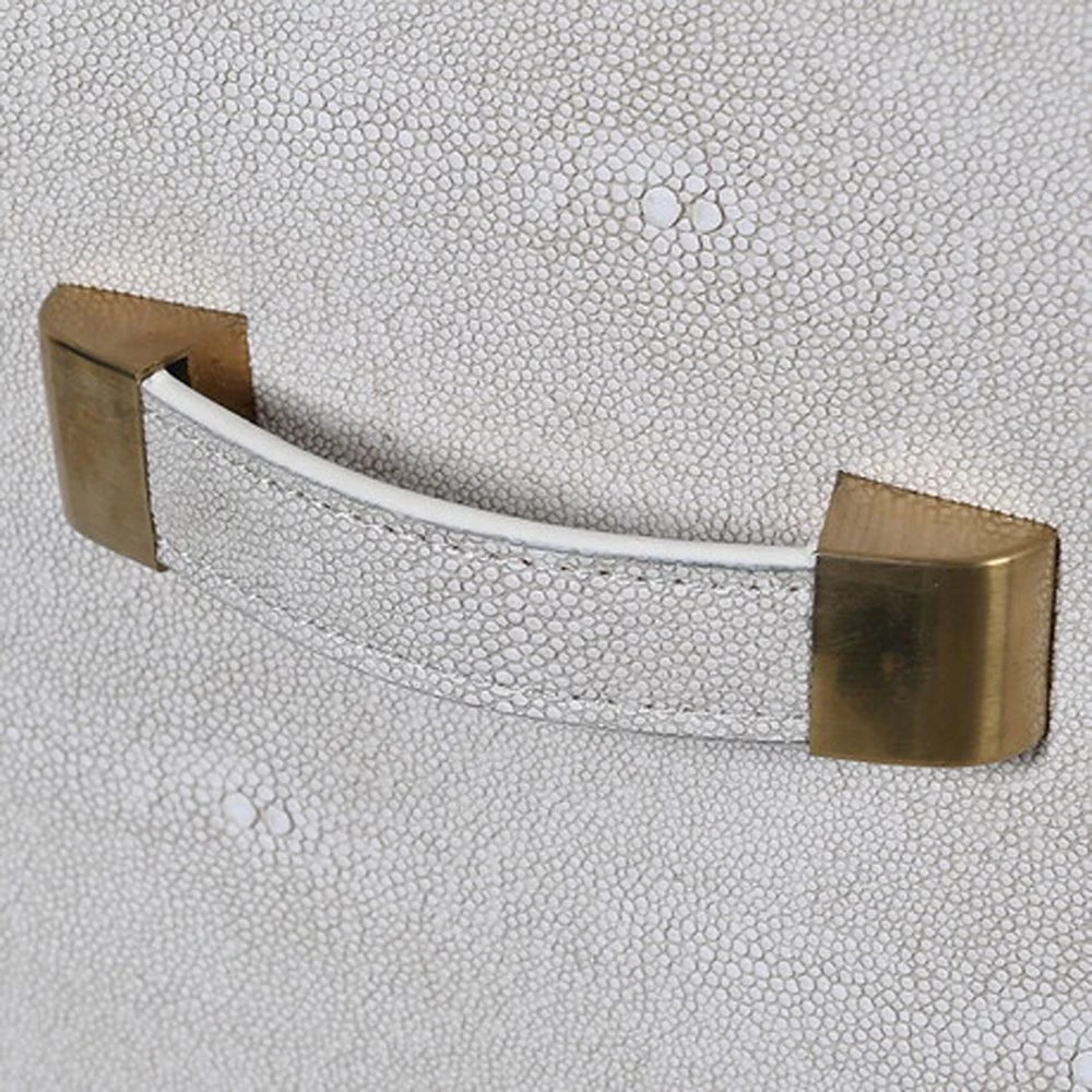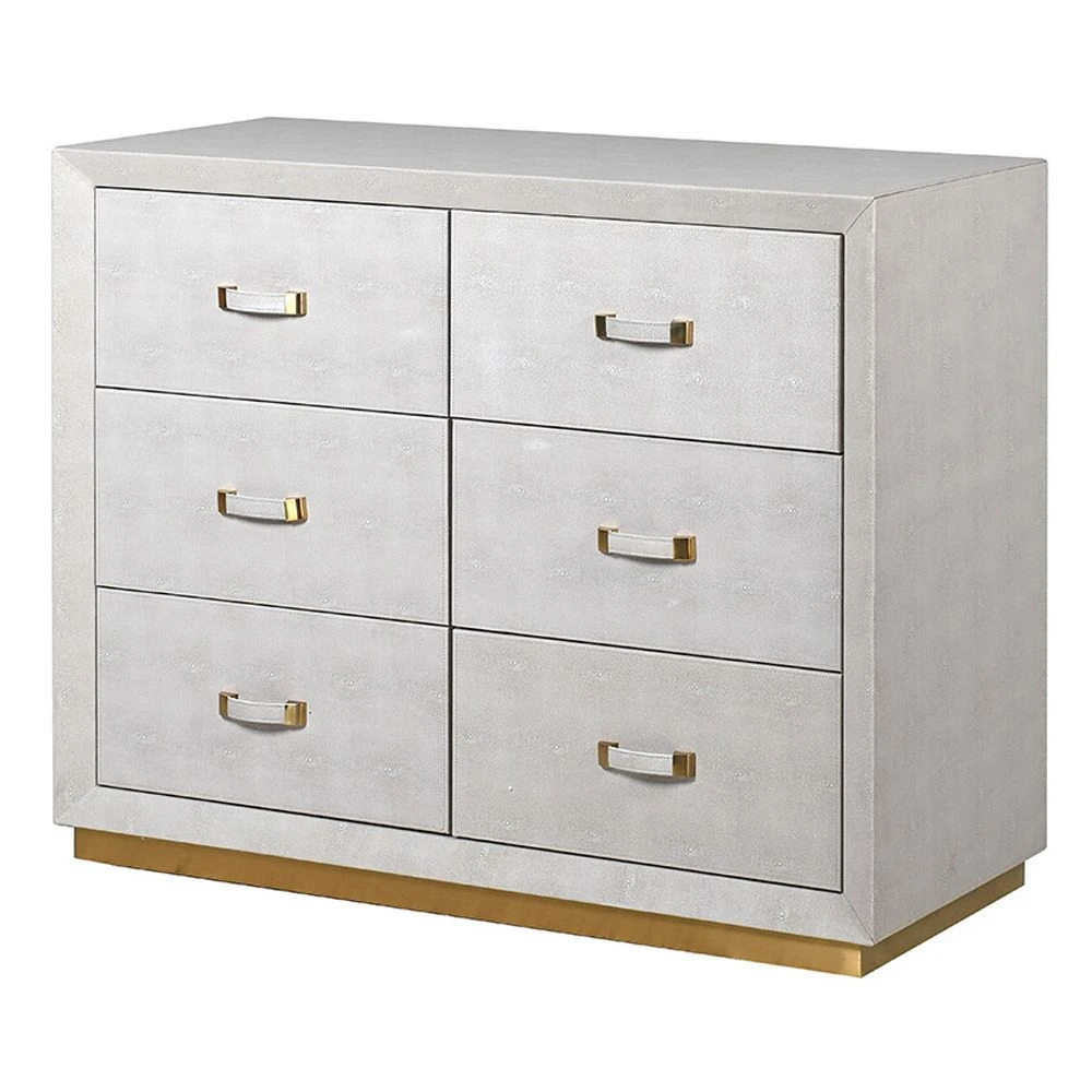 The Imara chest of drawers will make the perfect accent to your bedroom, no matter what the interiors! The chest is faux shagreen and finished in a gorgeous ivory colour, welcomed nicely by a polished gold base and golden details.