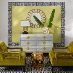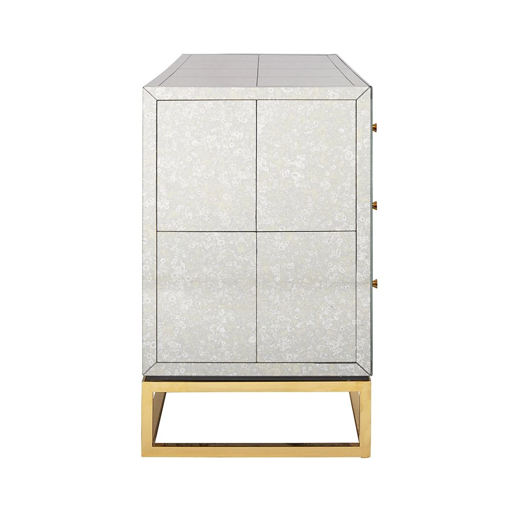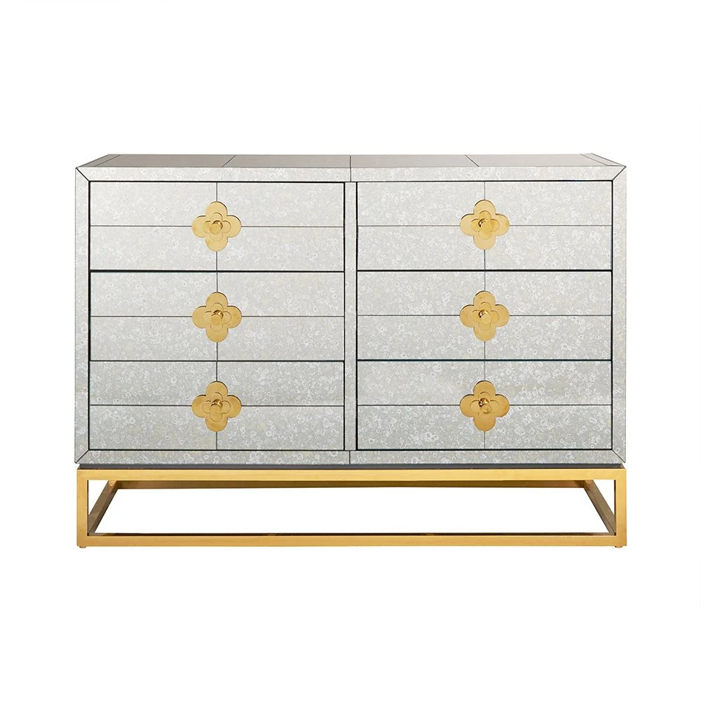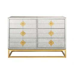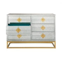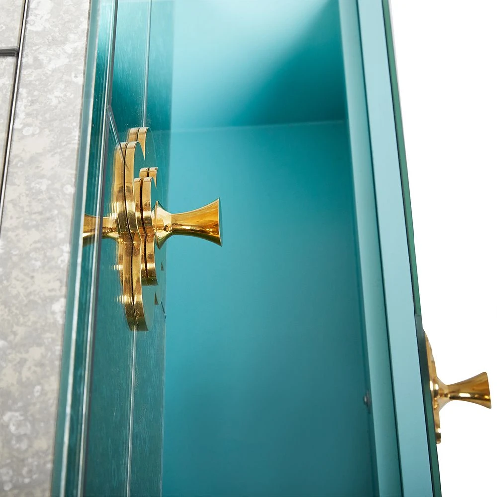 The glamorous Delphine 6-Drawer Chest combines minimalist form with maximalist glamour to create a truly unparalleled piece. It is made from antiqued glass with a polished brass base with six drawers that open to reveal a bright robin’s egg blue interiors.