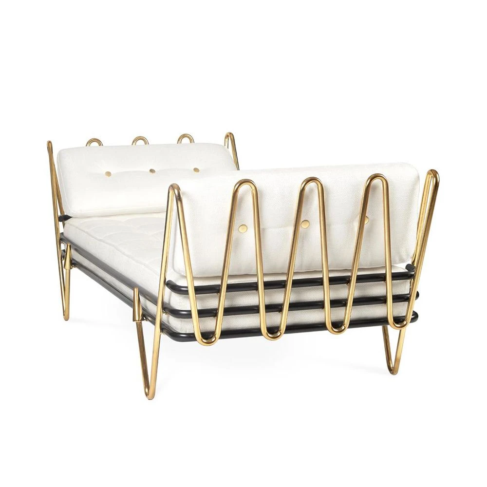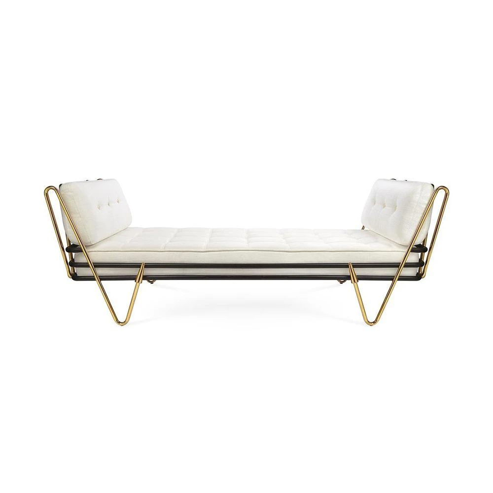Sumptuously chic and elegant, the Maxime Daybed by Jonathan Adler hits all the right notes. The luxurious brass frame cradles the lavishly upholstered cushion and bolsters.