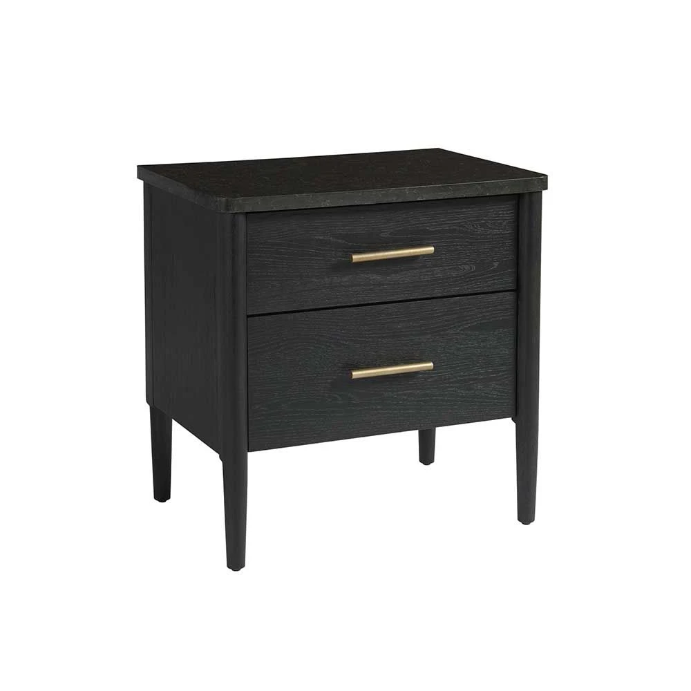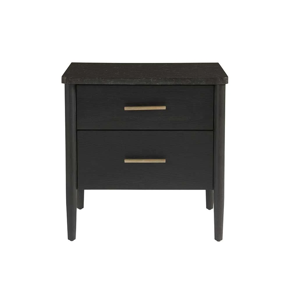 The Langley Bedside Table will elevate bedroom spaces with its rich brown-black finish, convex bar hardware, and its distinctively grained marble stone top.