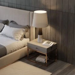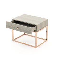 Add an instant sense of modern glamour to your bedroom with the chic and sophisticated Ester Bedside Table! This one-drawer piece comes in a lovely aged oak and has a dazzling gold base.