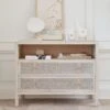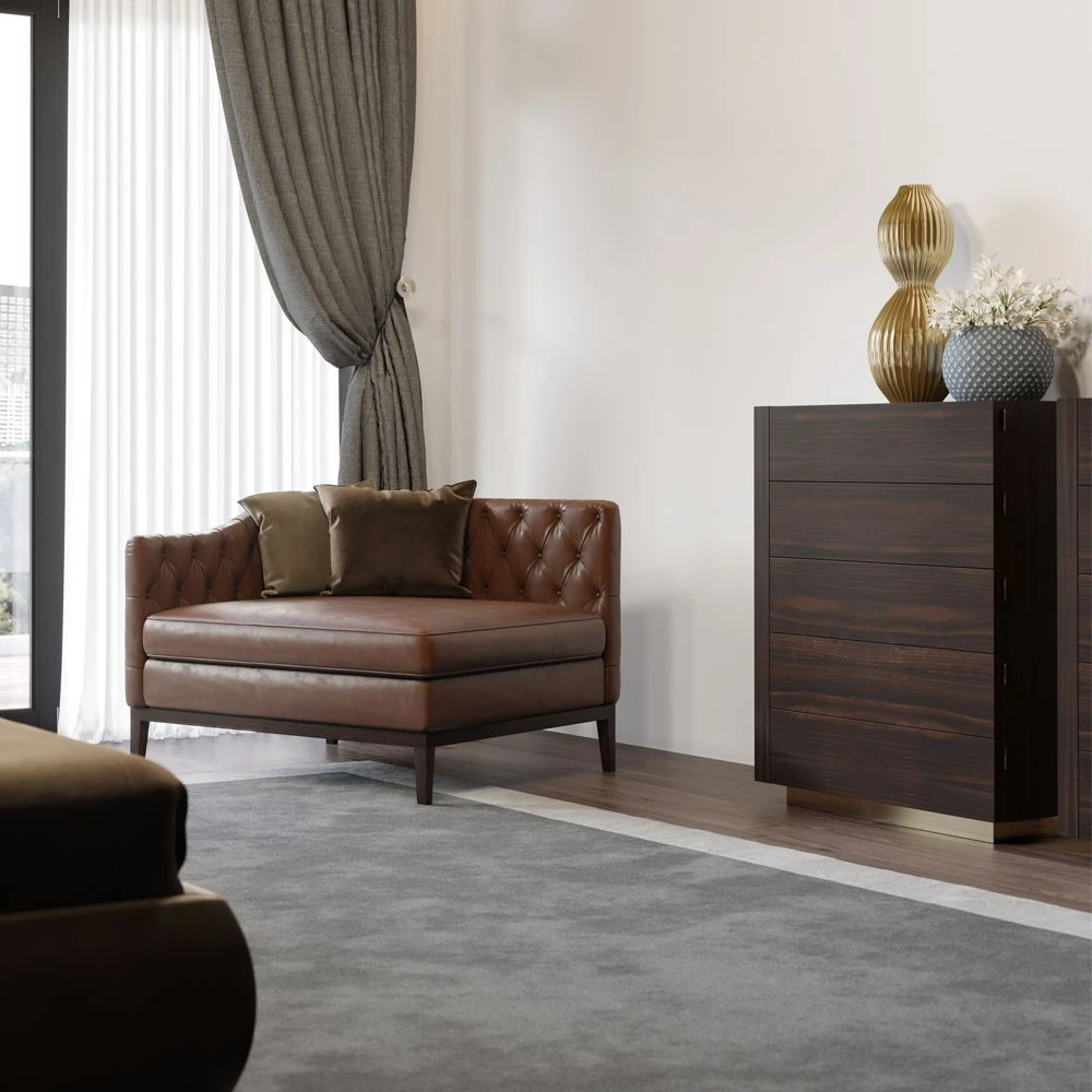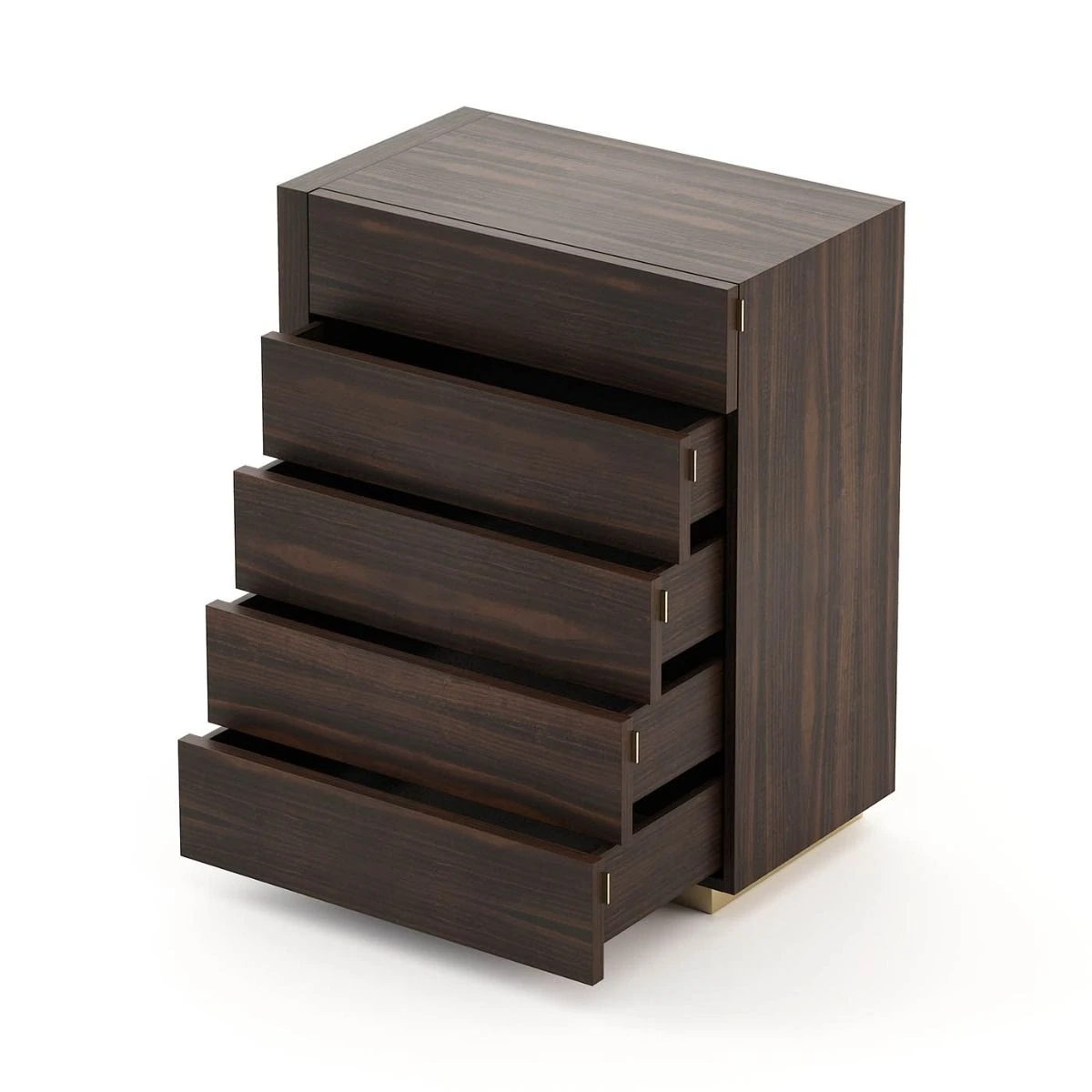 Introducing the Laskasas Kira Tallboy! With its minimalistic, modern design, this tallboy makes the perfect storage solution for ultimate convenience and style. The matte smoked eucalyptus hue is complemented by the gold finish detailing, a timeless piece for your bedroom interior.