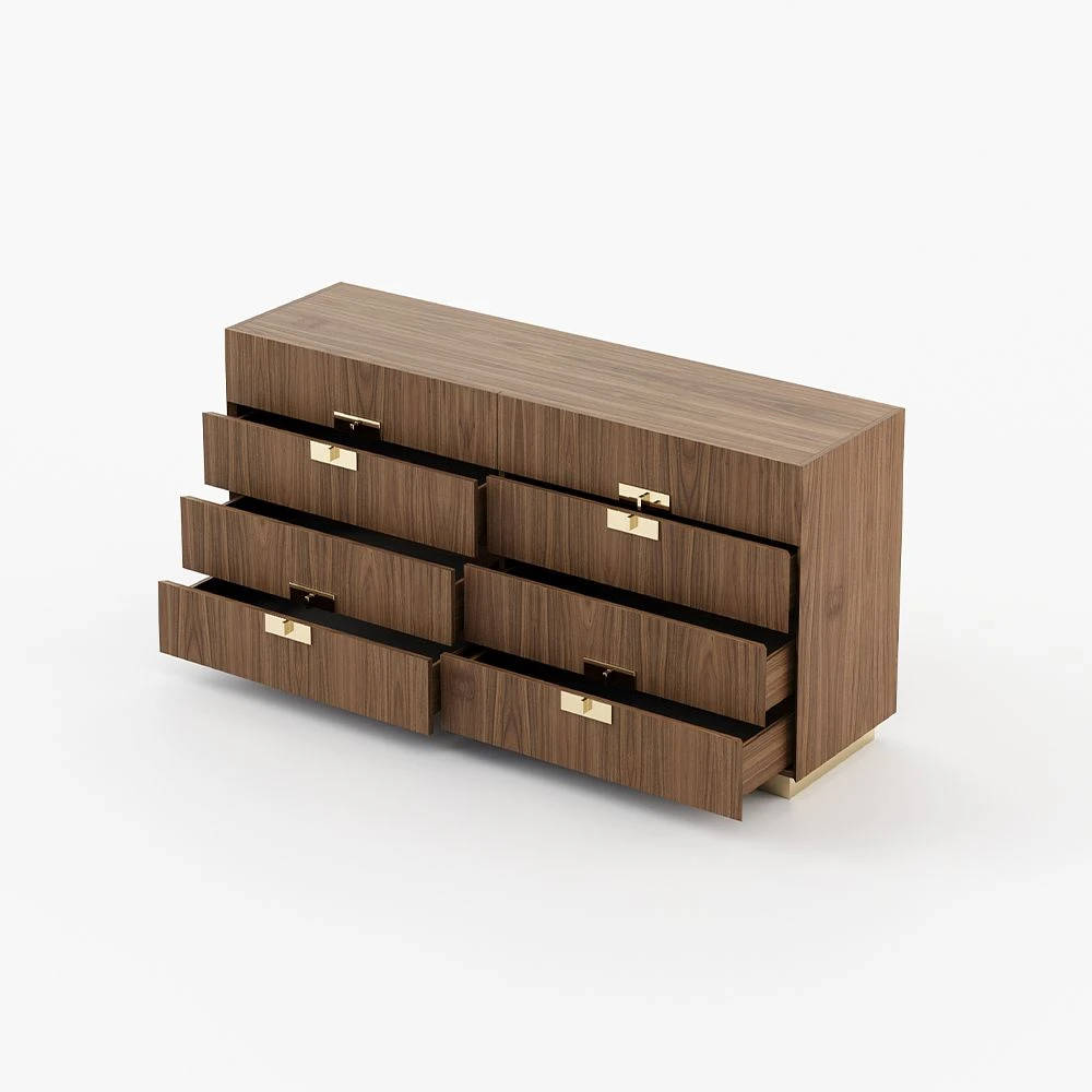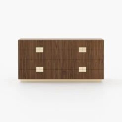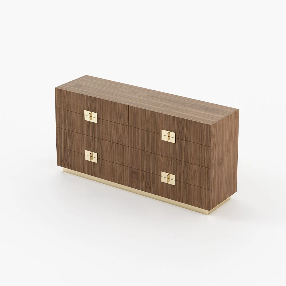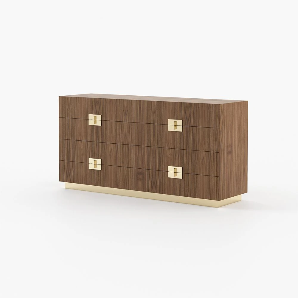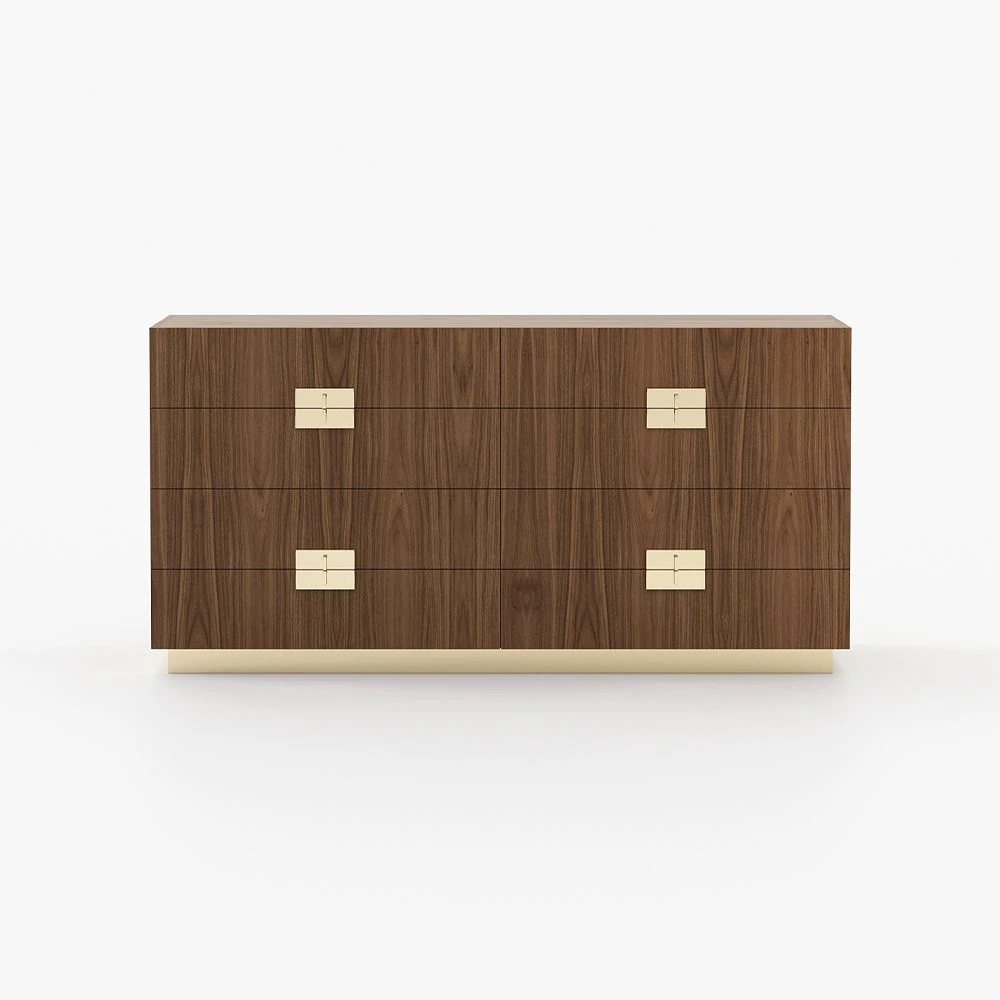 Enrich your living space with the luxurious Lady Chest of Drawers by Laskasas. This chest comes in a chic, walnut matte finish with golden accents that is sure to bring irresistible modern glamour to your bedroom décor.