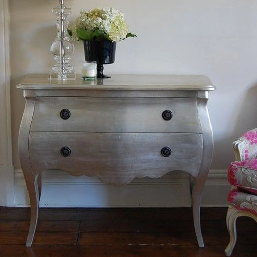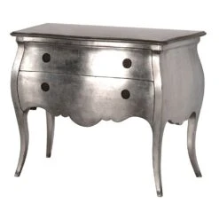 As seen in Period House. This beautifully elegant silver leaf chest of drawers works perfectly in a bedroom, living room or hallway. A beautiful solution for storage, with elegant bowed legs and subtle curves. This chest is a perfect French style piece with a hand finished silver leaf effect. Nice roller mechanism on the drawers. *Our products within this range are in general made from a medium grade Mahogany timber, sourced from forests which are all part of regeneration programmes. Some of…