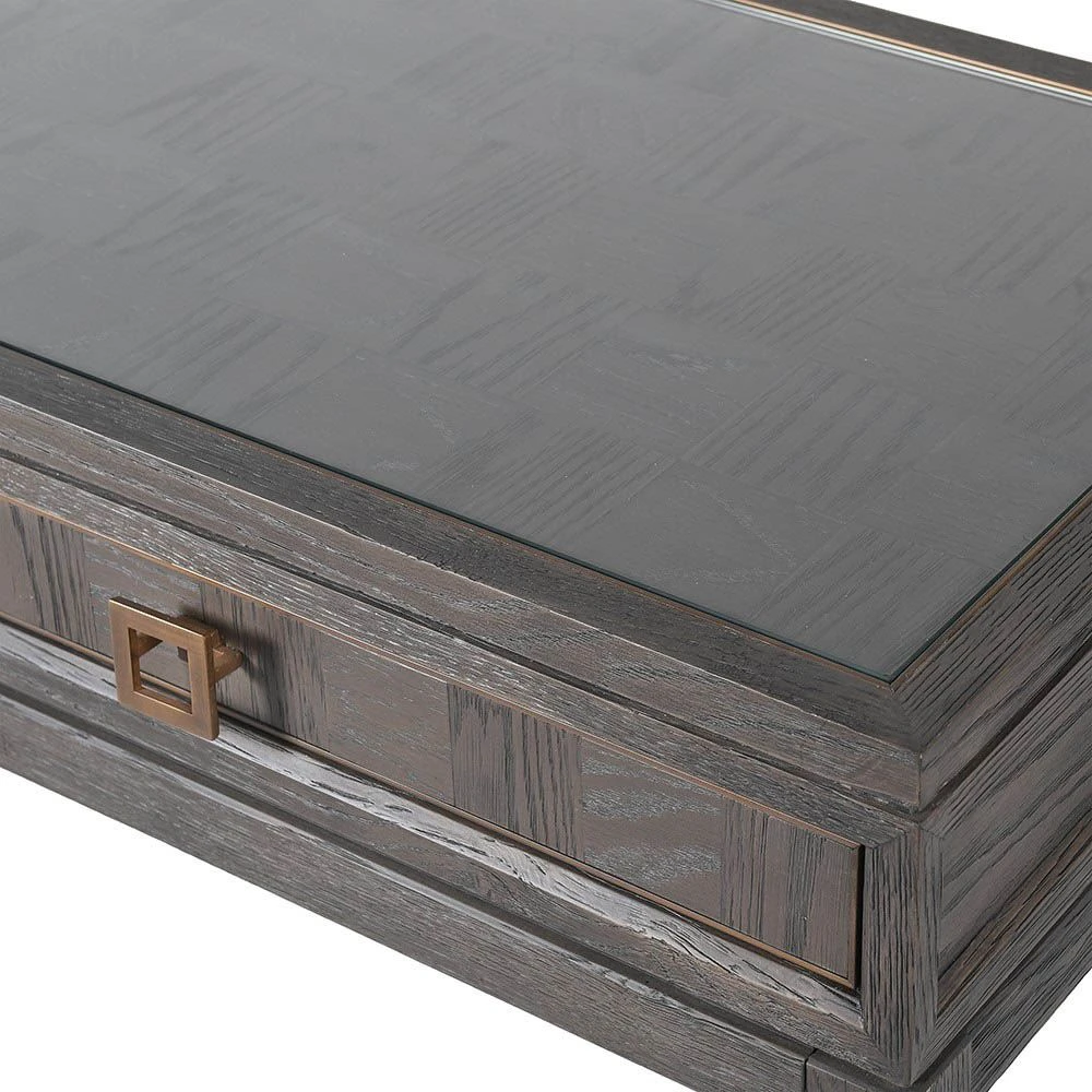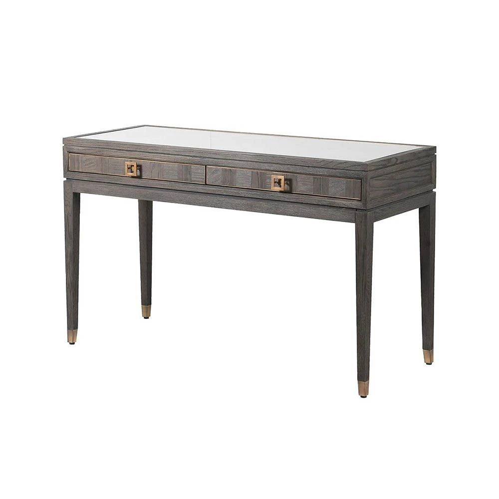 This two-drawer dressing table features a gorgeous glass top for a sleek and modern appeal. The cubist accents and brass detailing gave this piece a sophisticated allure that will suit a variety of interior styles effortlessly while keeping trinkets and beauty accessories stylishly out of sight.