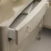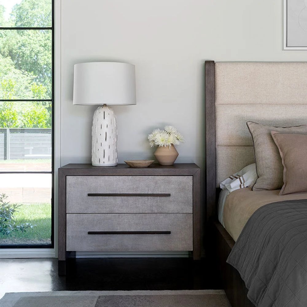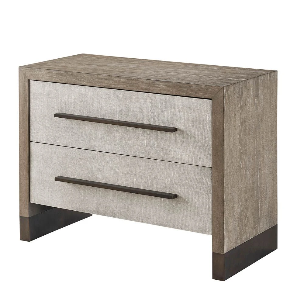 The Royal Tunbridge Bedside Table exudes sophistication and elegance with its contrasting taupe linen finished fronts. Finished in a weathered oak exterior, this table will add a touch of timeless class to your sleep sanctuary.