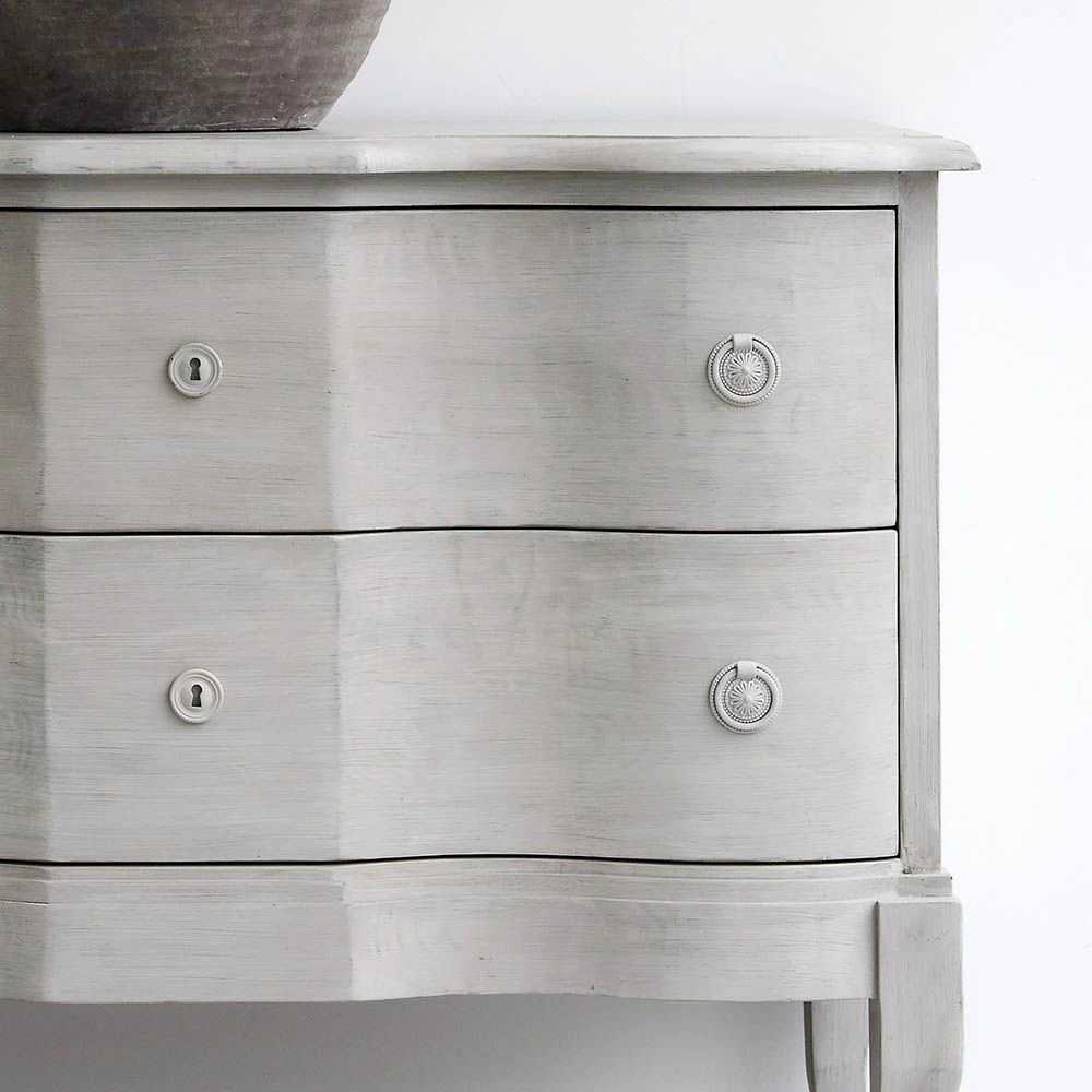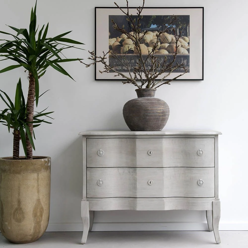 The Sasha Chest of Drawers boasts a lovely white distressed finish and two sturdy drawers, complete with door pulls and keyholes for decorative flair. The light wooden finish gives this piece a timeless feel, and the gentle curves in its construction mean that it is endlessly charming in any room. It is supported by four carved legs which elevate the chest, giving it extra height, and is topped with a stunning layer of wood, providing extra dimension and beauty to this piece.