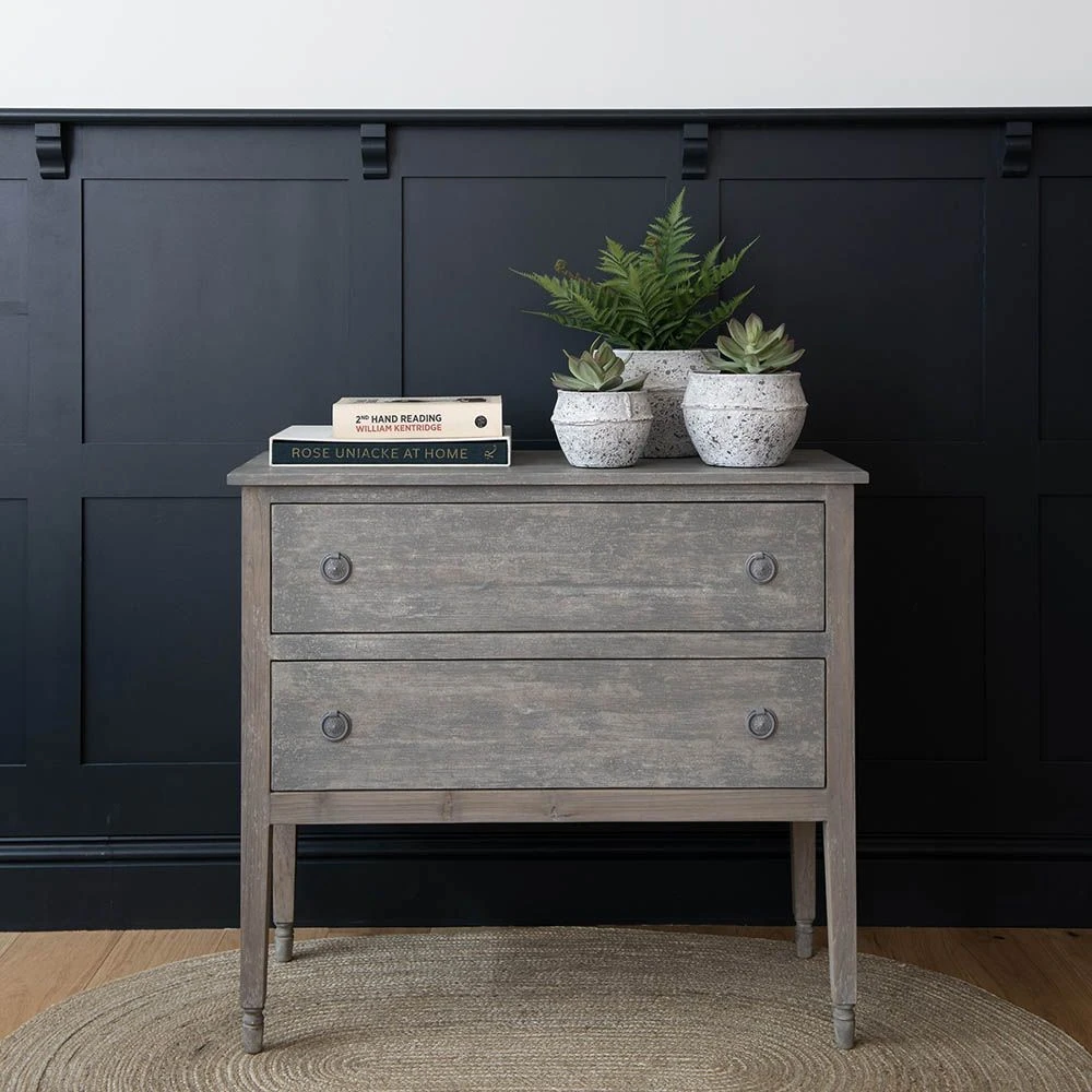 For lovers of the shabby chic style, this elegant two-drawer chest is a stunning addition to the home. With two drawers for storing away household clutter and a stunning distressed, grey-wash finish, this piece exudes a sense of versatile, rustic charm that will make your interior feel wonderfully stylish and homey.