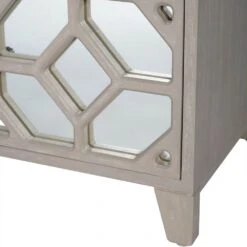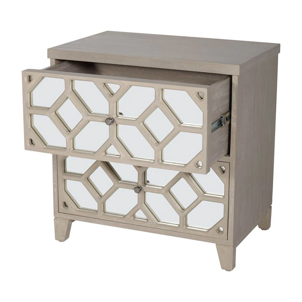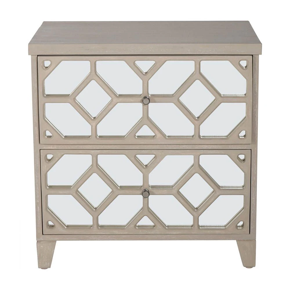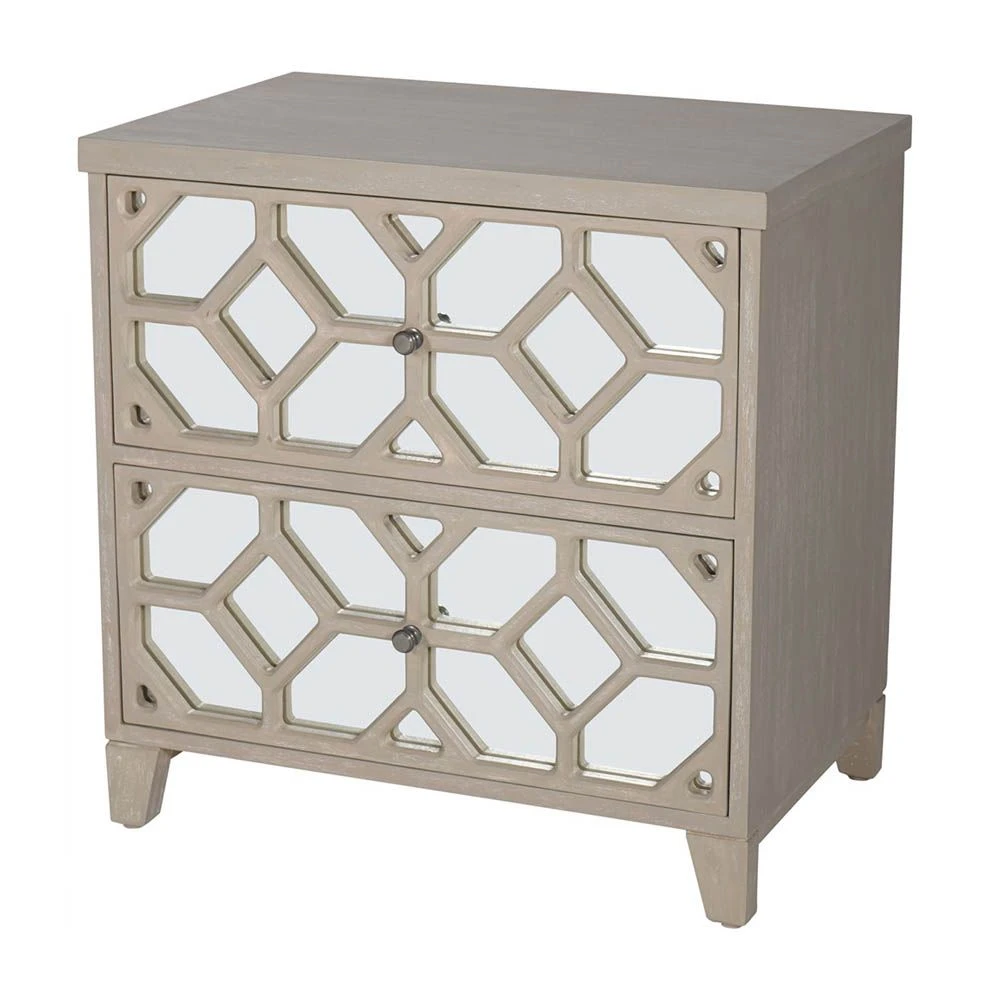 Brighten up your interiors with the Terresia 2-drawer Side Table. The versatile size of this piece makes it ideal for beside sofas or as a bedside table, with two drawers for storing living room essentials. With a hand-finished distressed wash, intricate wooden fretwork, and a mirrored glass backdrop, this table brings elegance to any room.