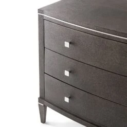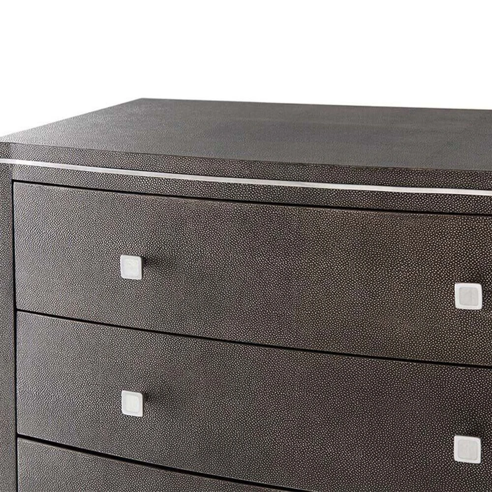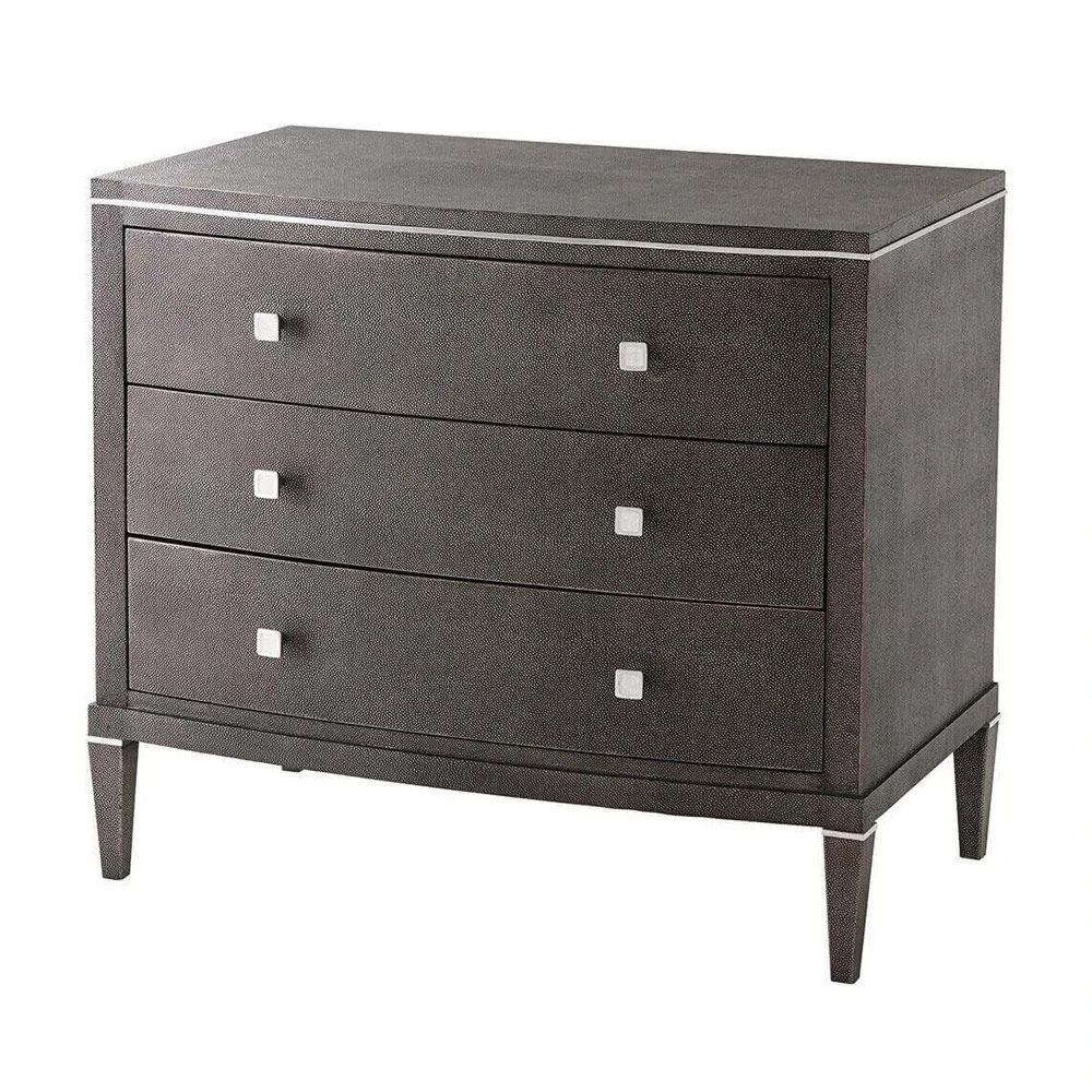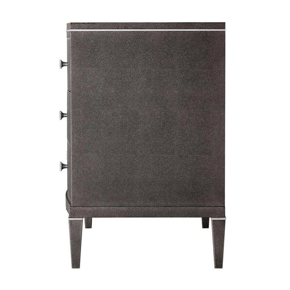 The stylish, Adeline Bedside Table is a standout piece that will exude sophistication and luxury in any bedroom. This versatile piece doubles up as a chic chest of drawers and is complete with three spacious drawers for all of your storage needs. Its curvaceously contemporary design is finished with stunning, shagreen leather, polished nickel accents, and elegant tapered legs. This opulent bedside table will make a sensational addition to any interior.