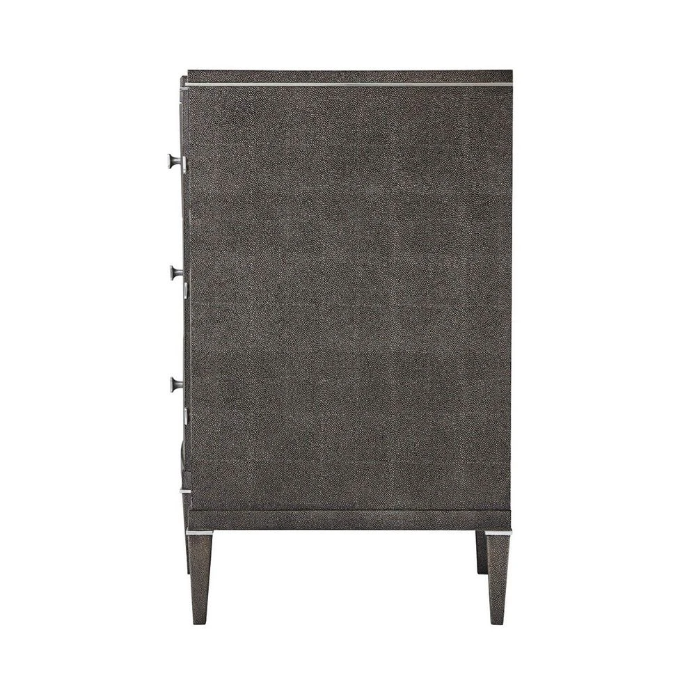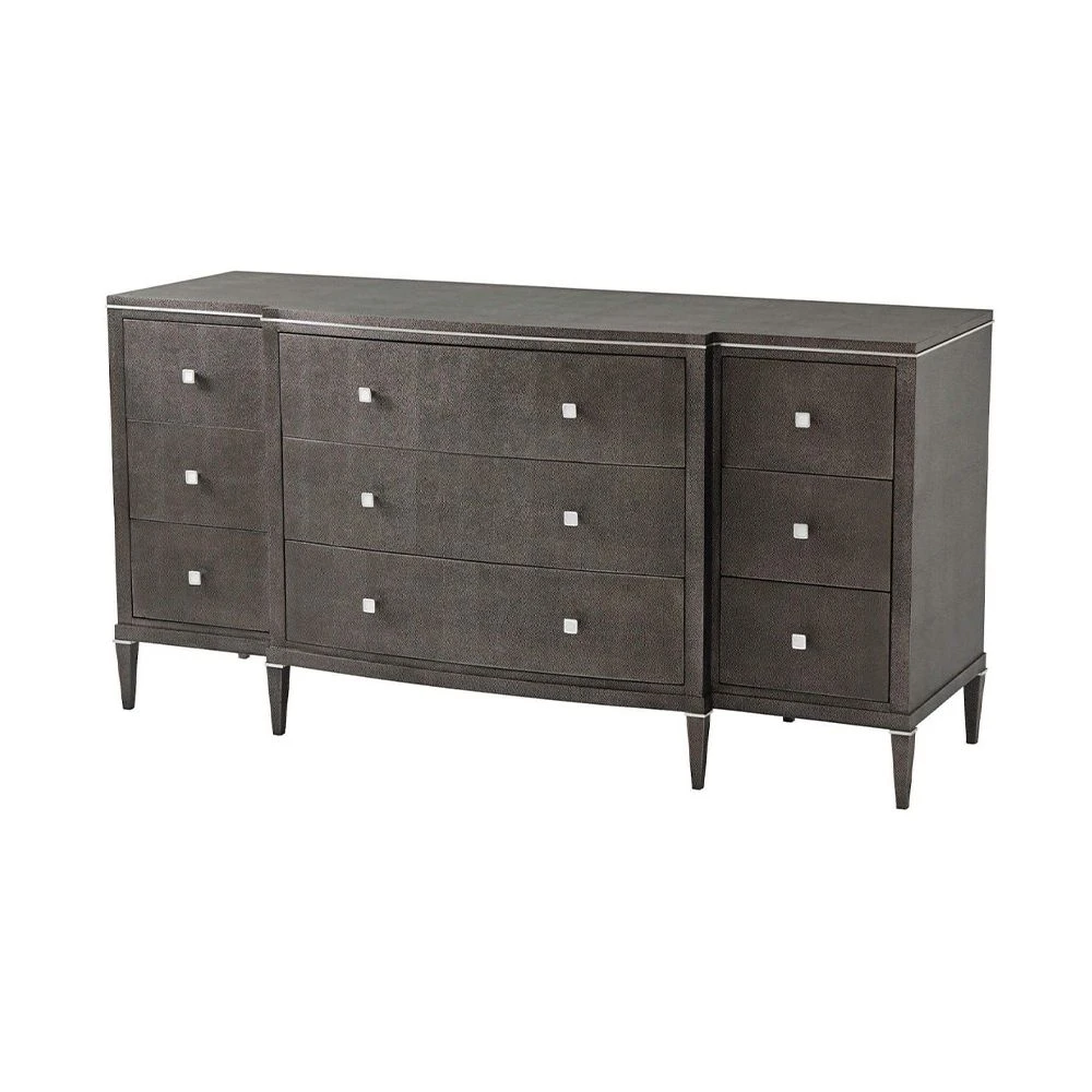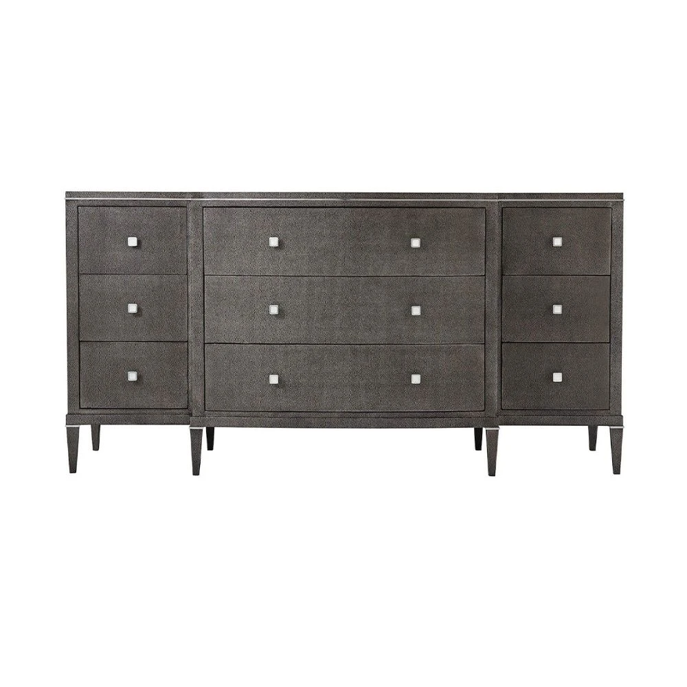 The modern, Adeline Dresser is an exceptional storage solution for any bedroom. This statement dresser features nine drawers finished in stylish shagreen leather for a textural finish and polished nickel handles for added glamour. This delightful dark brown dresser is a luxury, versatile piece that will bring elegance and sophistication to any room in your home.