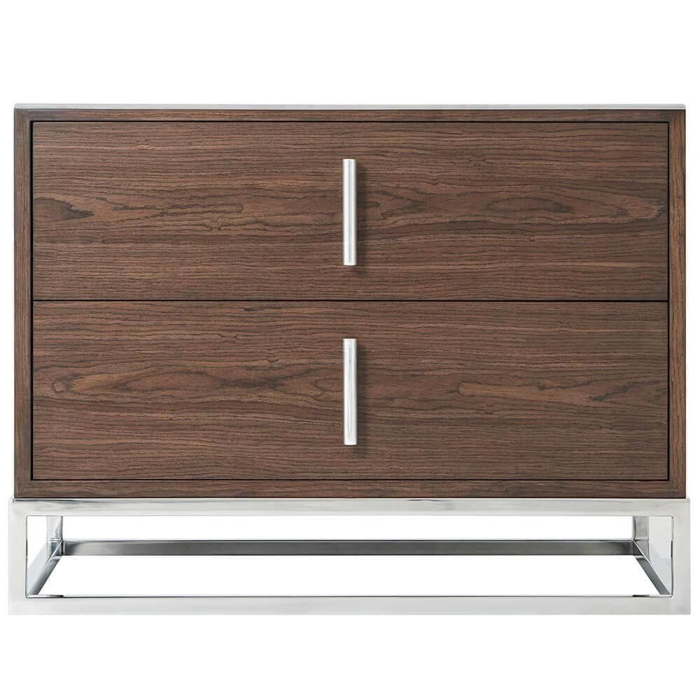 Indulge in this luxuriously rich brown Theodore Alexander Blain Bedside Table, sculpted from a walnut-grained wood veneer to add a touch of contemporary glamour to your bedroom. Moulded with a geometric metal base and matching handles, these mesmerising accents are perfect for adorning a sophisticated and stylish space.