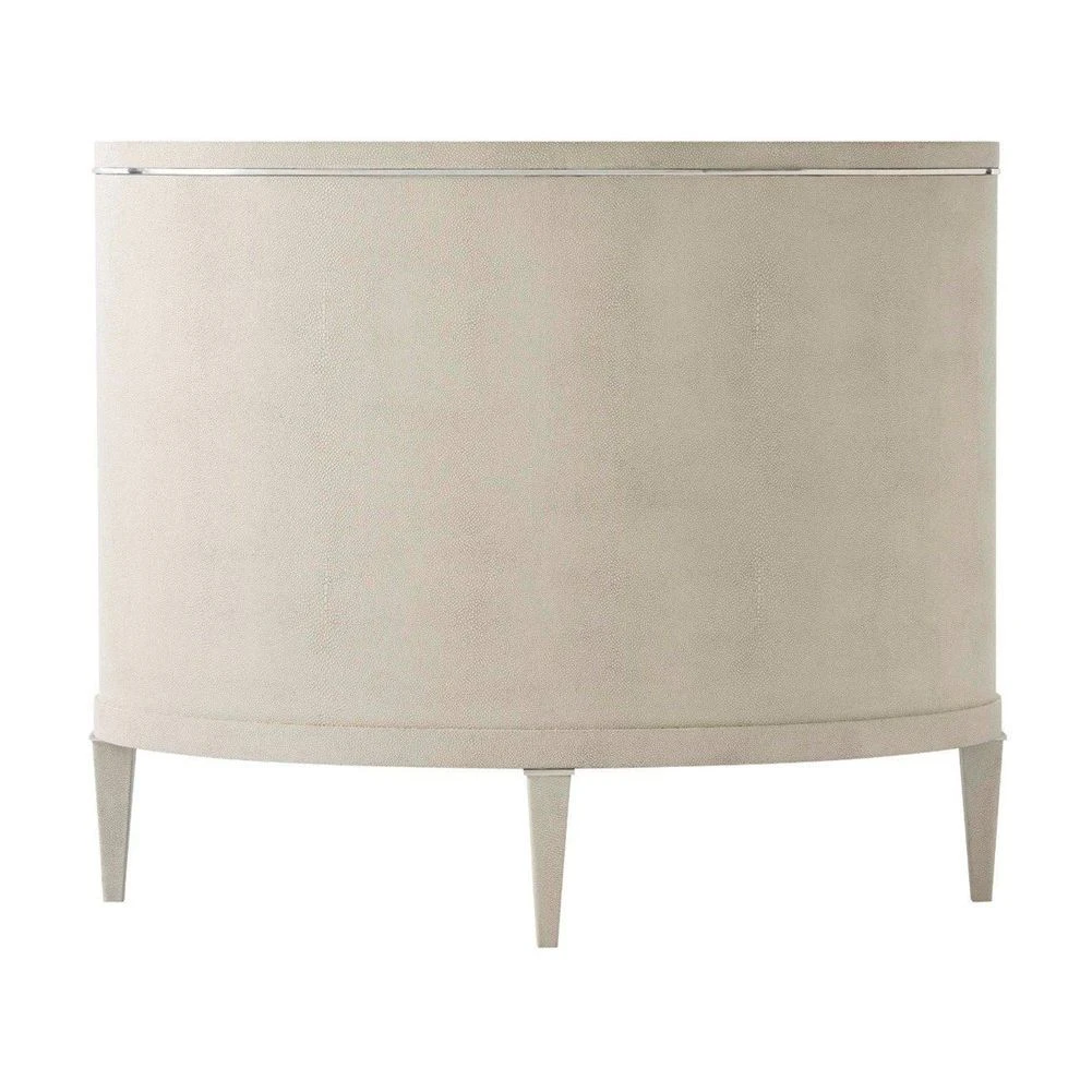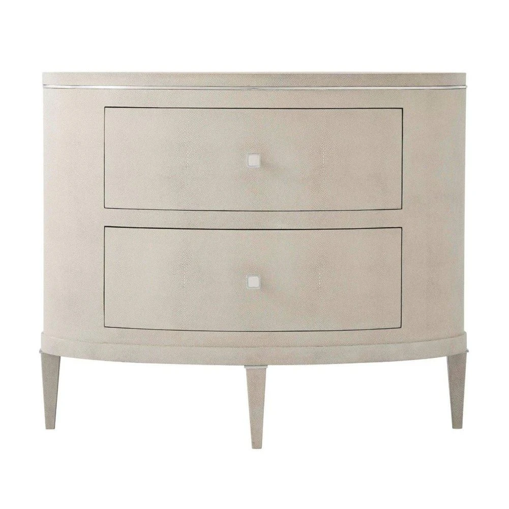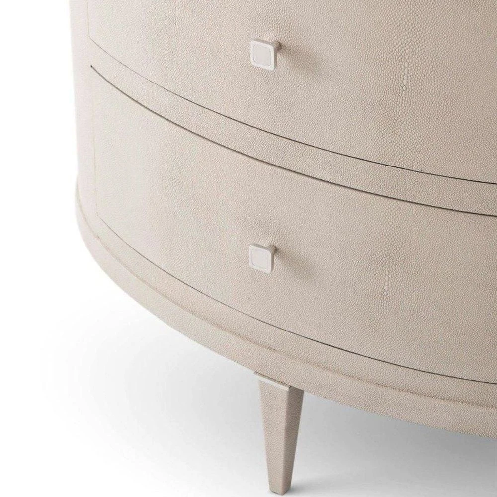 Make a stunning statement with this playful and elegant Eli Bedside Table. Its oval shape lends itself beautifully to a contemporary setting, offering a striking sense of luxury as well as illustrious charm. The bedside table has a shagreen finish in a dreamy cream colour. This piece also has two spacious drawers to enhance your bedroom storage, making it as delightfully functional as it is stylish.