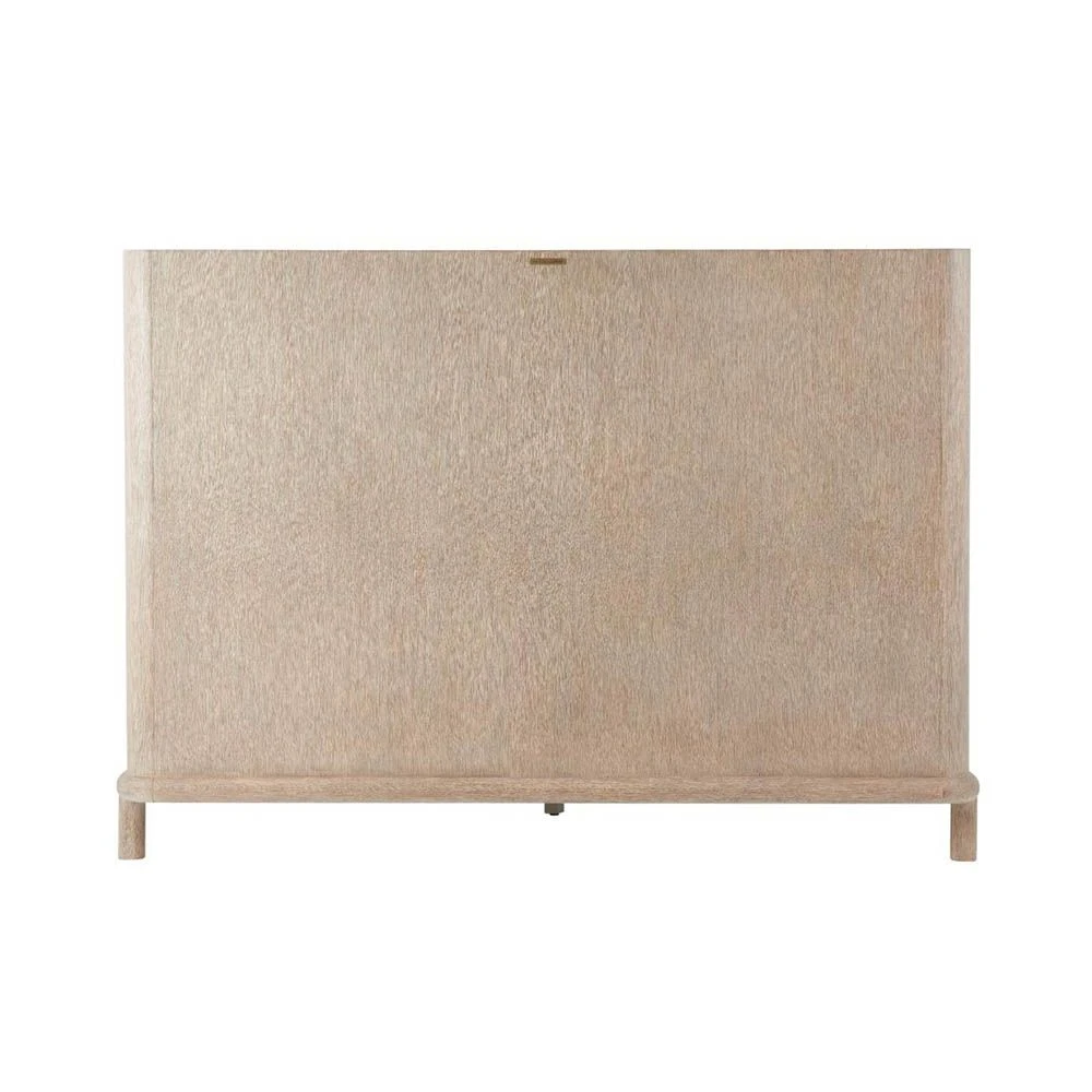 Set a statement with the Theodore Alexander Superking Panel Platform Bed in Bermuda Ivory. This piece is beautifully raised on round mission-style legs, with a fully veneered panel headboard featuring wings finished in grey oak veneer to complete the bed.