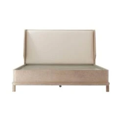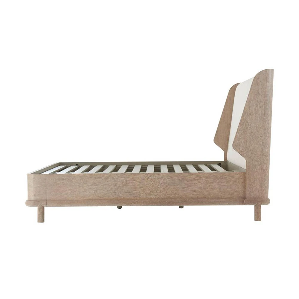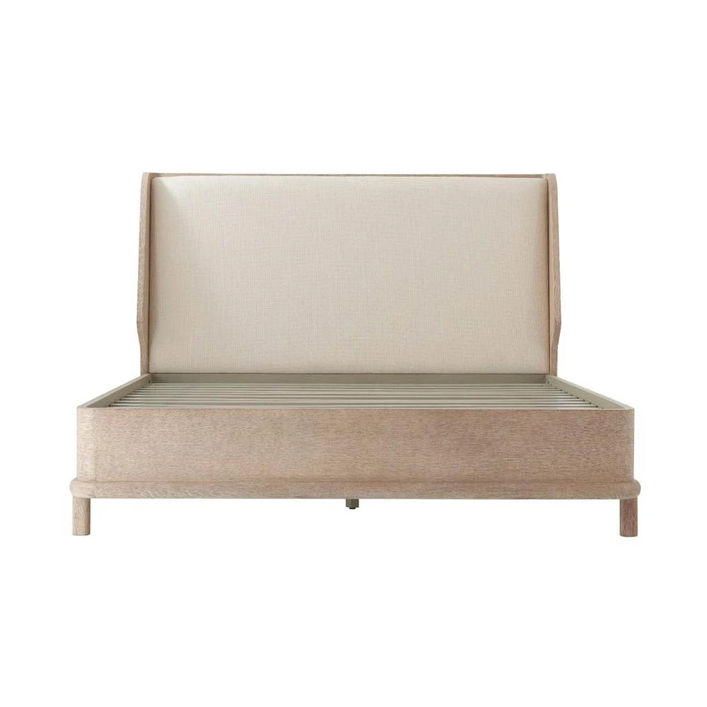 Set a statement with the Theodore Alexander Superking Panel Platform Bed in Bermuda Ivory. This piece is beautifully raised on round mission-style legs, with a fully veneered panel headboard featuring wings finished in grey oak veneer to complete the bed.