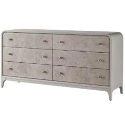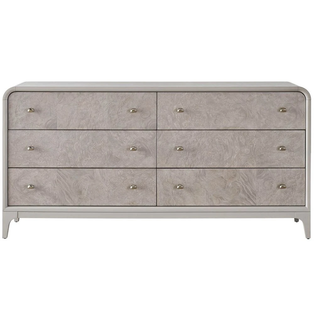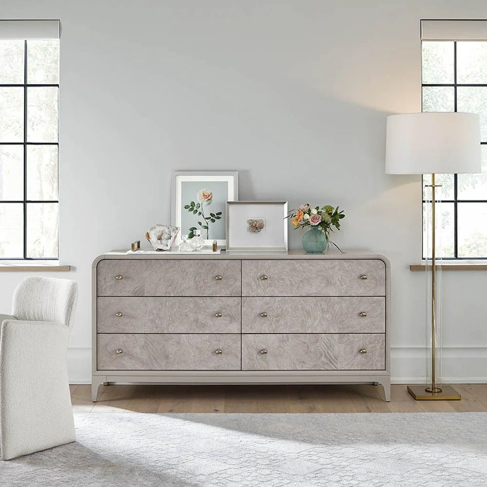 Bring stylish sophistication to bedroom spaces with the Tranquility Immersion Dresser, a regal statement piece featuring luxurious wood burl veneer accents complemented by dreamy pull hardware.